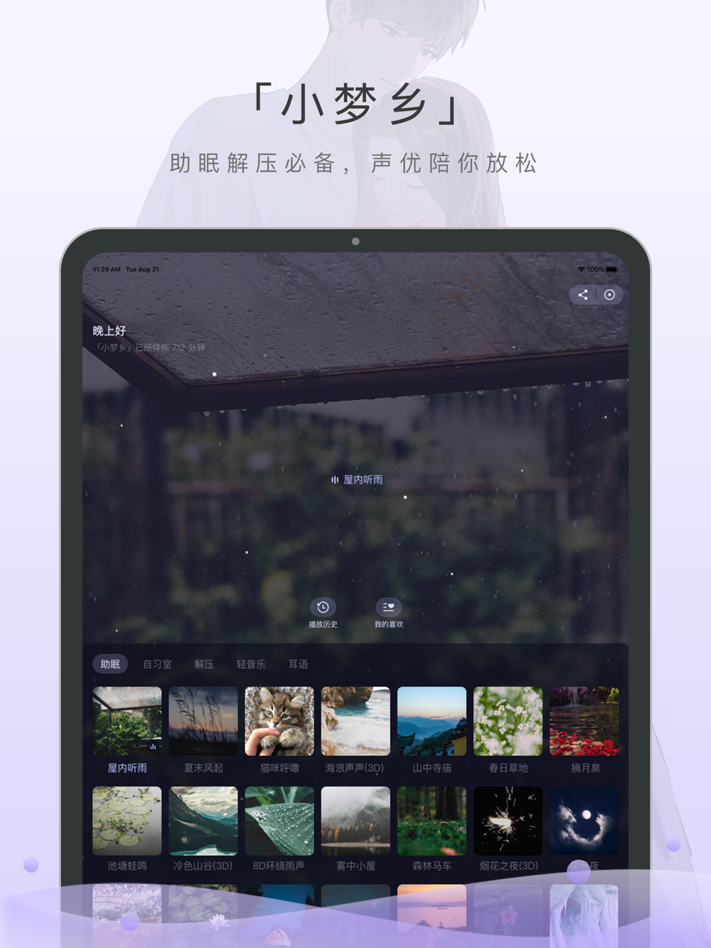 睡前时光,听着小姐姐或者男神的温柔声音入睡; 深夜难眠,来一段催眠的雨声树林声降降火。