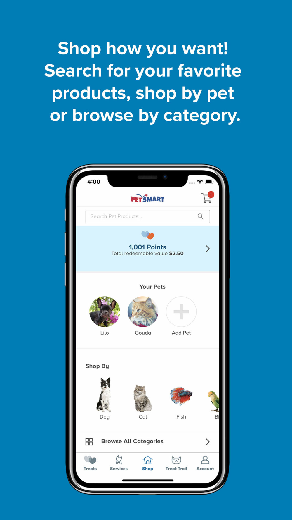 At PetSmart, we know being a pet parent is one of life’s most rewarding experiences. It also raises many questions! So, we’ve built our app to be a valued resource for every step of your journey as a pet parent. You’ll find helpful articles, products, services bookings and can shop for all your pet needs in one place.