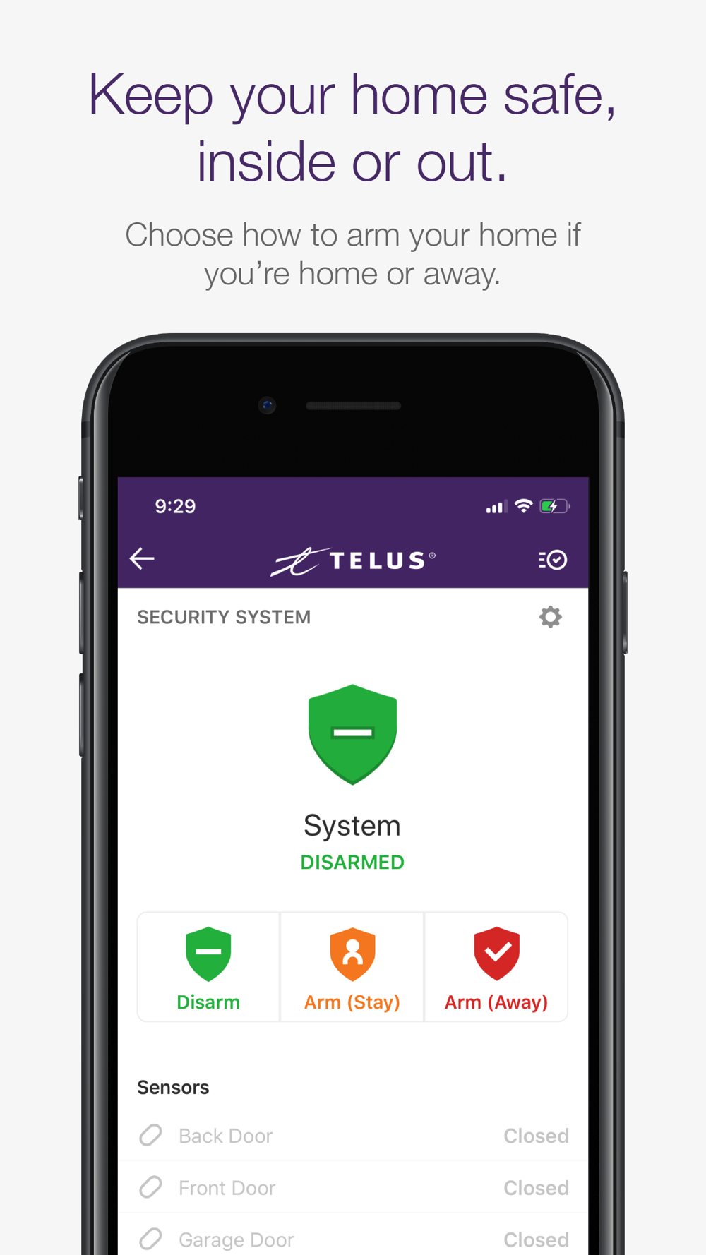 Note: This TELUS SmartHome app requires a compatible system, internet access and a TELUS SmartHome Security service plan. The app features and their usage varies based on the solution chosen, equipment and service plan. Visit telus.com/home-security for more information.