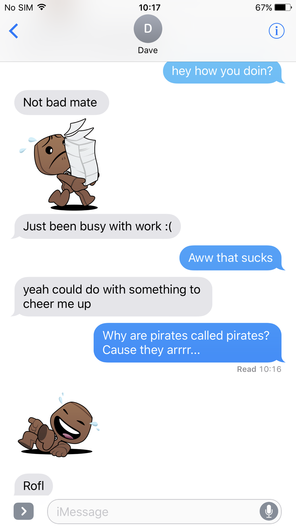 Get creative and express yourself with this pack of Sackboy iMessage stickers. Bring the fun of LittleBigPlanet™ to your iPhone chats: from sleepy to grumpy, from ‘ROFL’ing to just plain face-palming, this little hero’s got you covered with 22 emotes to choose from. If you’ve got something to say, say it with Sackboy.
