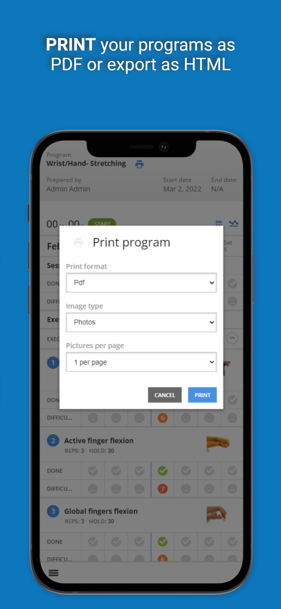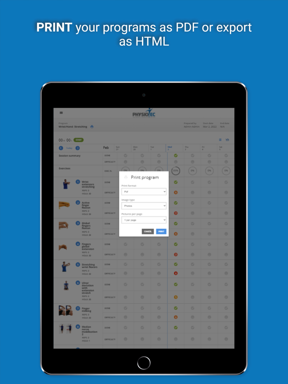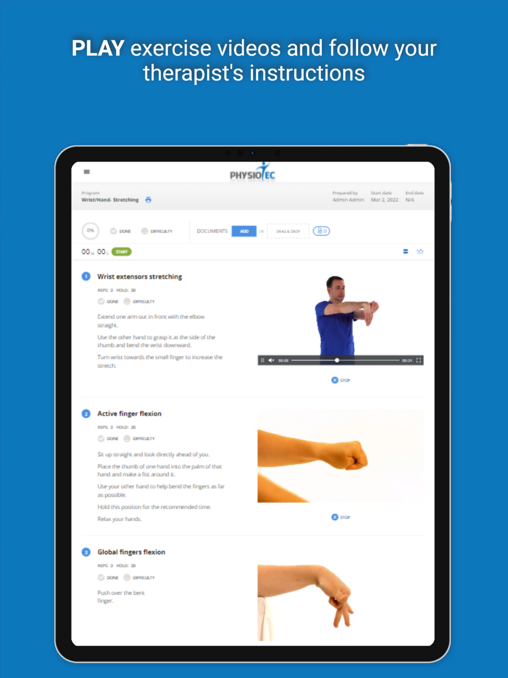 Physiotec was the first provider of rehabilitation exercise software to offer an online exercise prescription service that is accessible in real-time. Their innovative technology allows the creation of high-quality personalized exercise programs. All therapeutic, physical fitness, physiotherapy, and rehabilitation exercises are accompanied by descriptive images in the form of simplified diagrams, photos, or video clips, along with clearly written instructions. The exercises are grouped in different modules: geriatrics, neurology, orthopaedics, paediatrics, vestibular, amputees, cardio, pelvic floor, Pilates, plyometric, reinforcement, warm-up, yoga, etc.