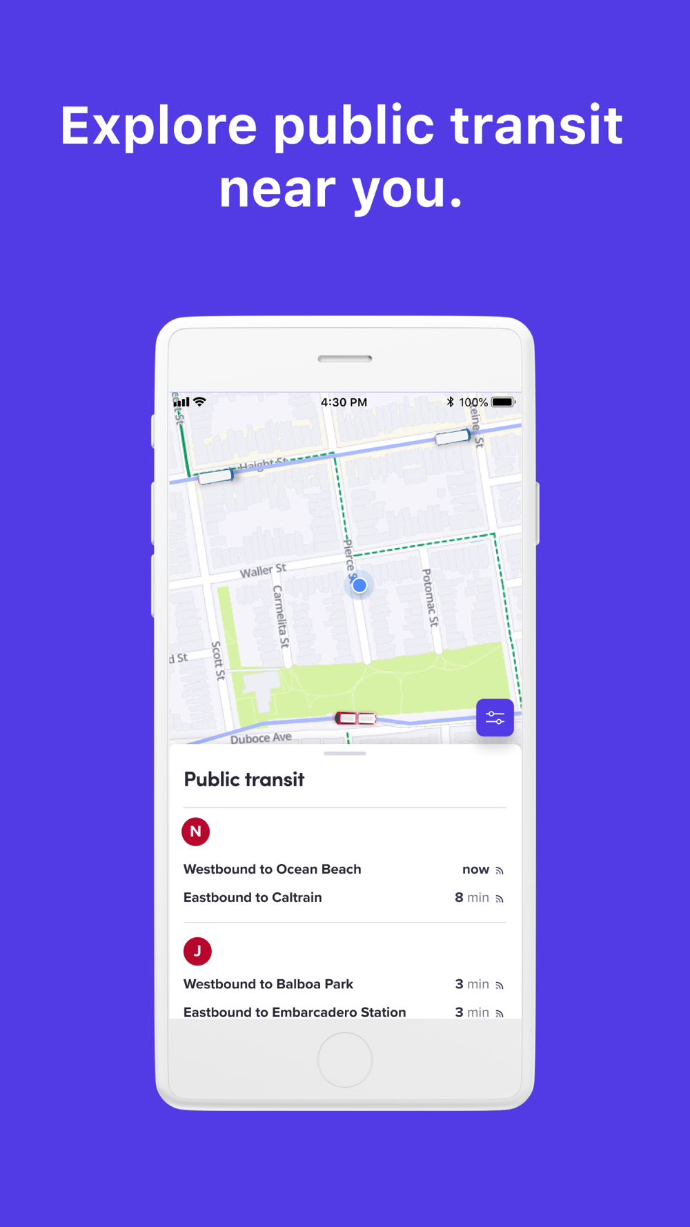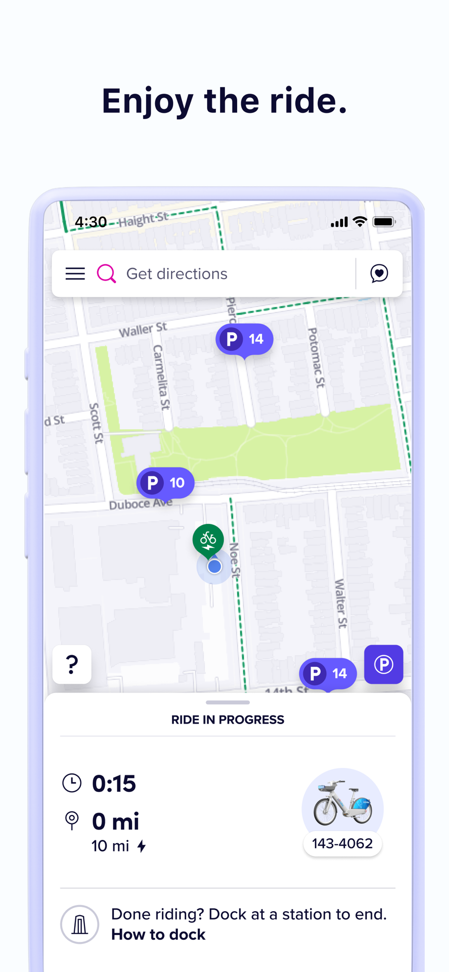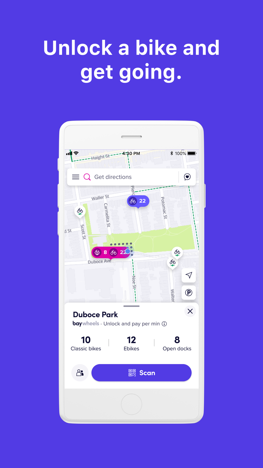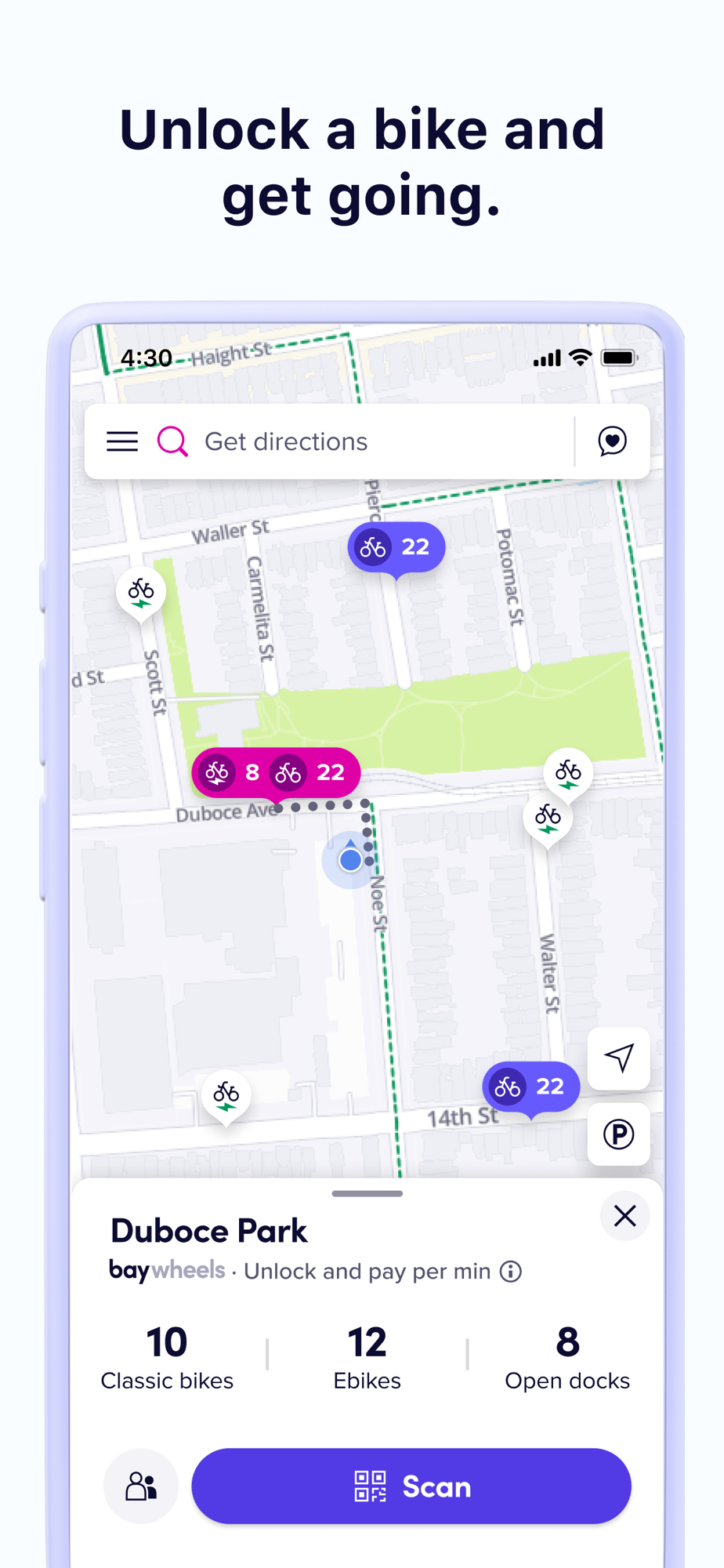 The Bay wheels App gives you access to thousands of bikes in your area — unlock and pay directly from the app and get going. You can also get walking directions and see public transit schedules to help you easily get to bike stations.