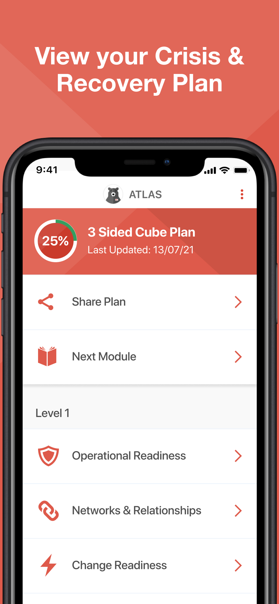 Created to specifically help small and medium-sized businesses, Atlas will become a knowledgeable member of your team and guide you on a unique journey toward business resilience. Working through levels and modules, you will learn to improve your preparedness by completing tasks and testing on your operational readiness, networks and relationships, leadership and culture, change readiness, and your ability to assist your people at work. Based on your progress and inputs, Atlas will skillfully auto-generate a shareable Crisis and Recovery Plan, which can be used to exercise your readiness for disasters, as well as educate your staff.