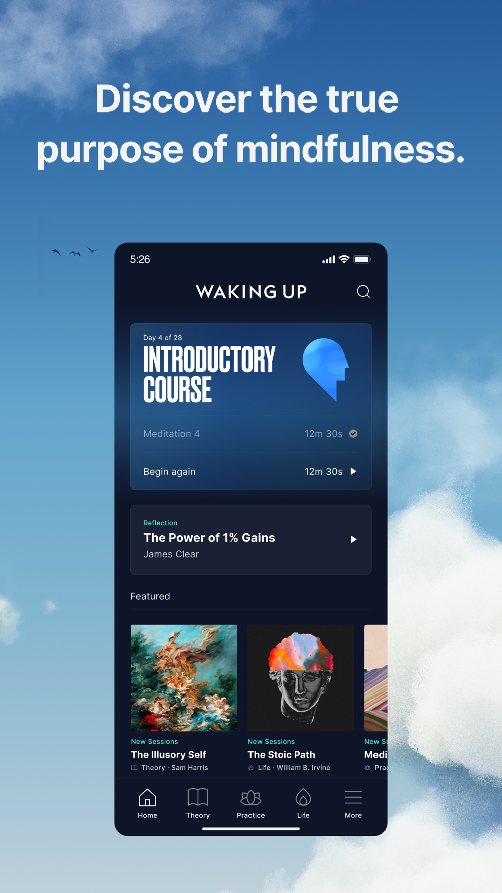 Waking Up supports your growth and development in a number of different ways. You’ll find an abundance of useful features, like meditation timers, in-app support messages, an ever-growing audio library, and daily reminders to help bring your mindfulness practice into your life—plus, Waking Up allows you to save all of your meditation sessions to your Apple Health app.