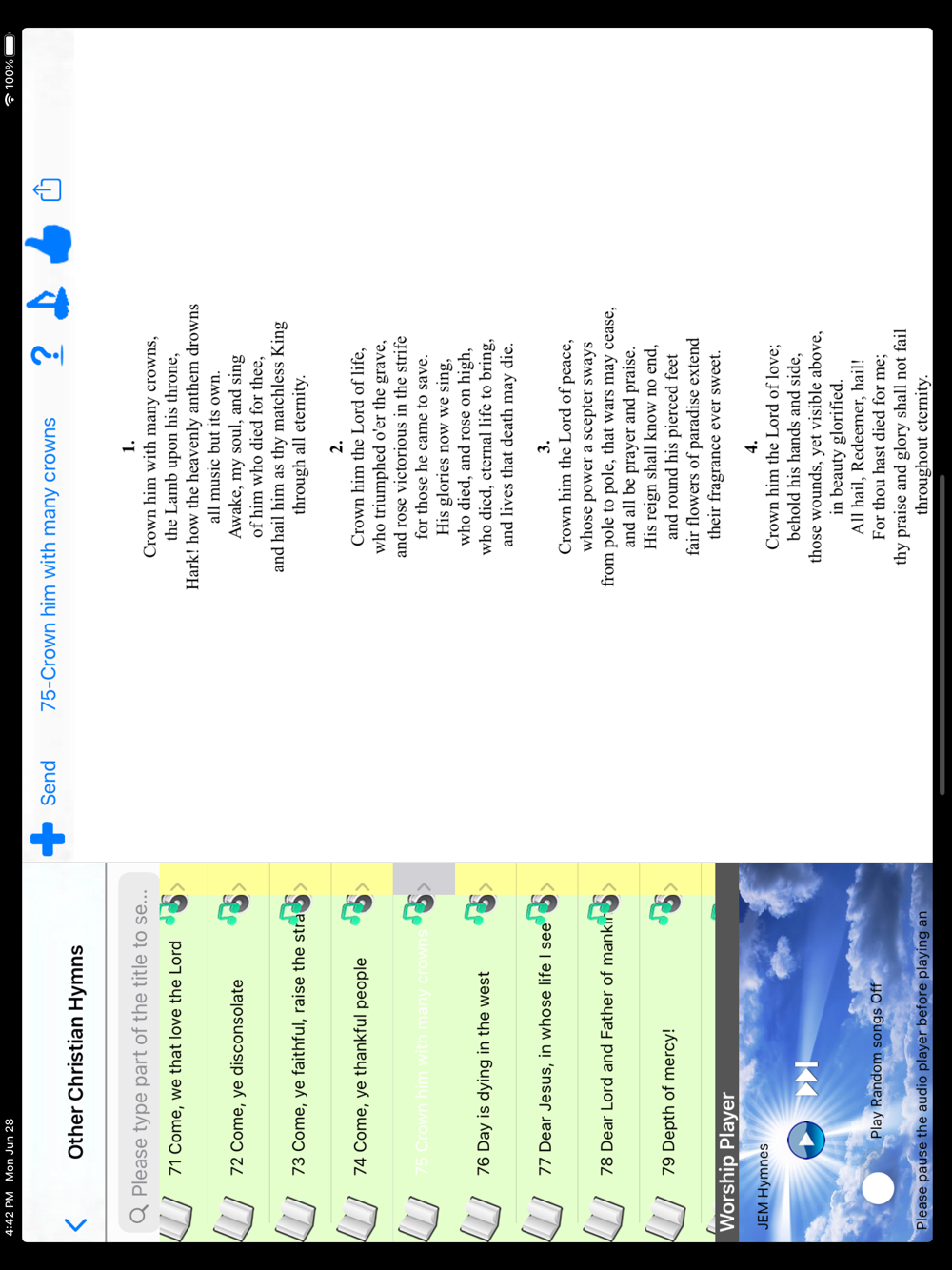 The beloved hymns of JEMs at the palm of your hands. Worship the Lord comfortably with this App. It also includes an English version of Traditional and Popular Hymns along with the music. Save to Favorites feature, Easy navigation.