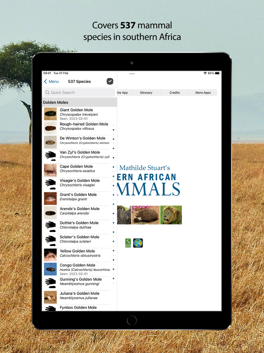 Discover and explore all 537 southern African mammal species with this comprehensive app by experts Chris and Mathilde Stuart. Fully updated, this app now extends coverage to Angola, Zambia, Malawi and northern Mozambique, featuring all southern African mammals, from aardvark, shrews and bats to the dolphins and whales that inhabit coastal and deeper waters. Detailed species entries, photographs, videos, calls, distribution maps and search-by-country functionality enable quick identification, making this app the go-to field tool for students, scientists and all nature lovers. Now with improved location data functionality and new Smart search parameters.