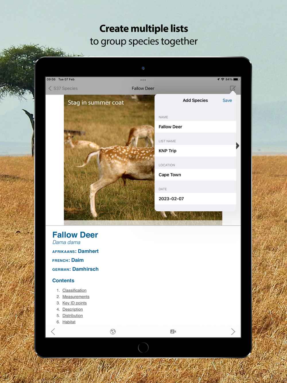 • Search and sort by English, Afrikaans, French, German or scientific names