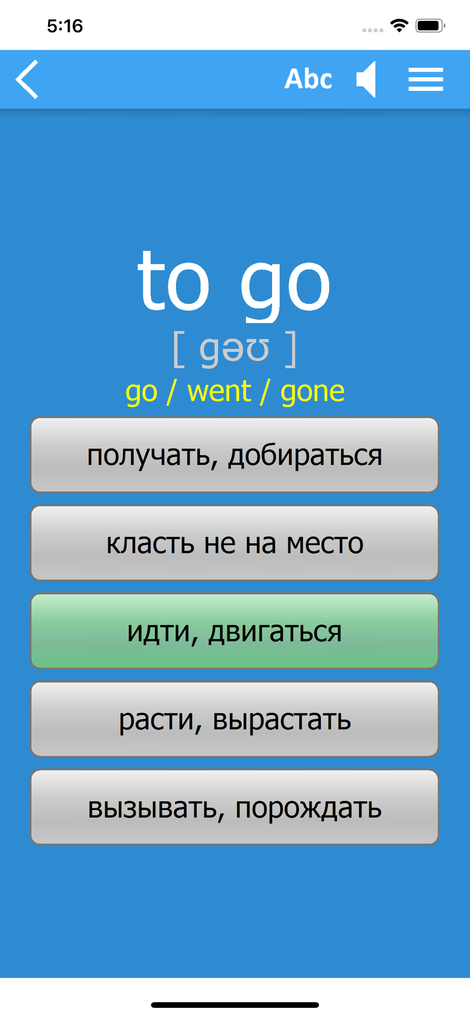 - принцип работы приложения: программа вразброс показывает английские слова (под словом размещена транскрипция, которая поможет правильно произнести слово, также слово по умолчанию произносится программой; чтобы повторно услышать произношение, нажмите на предлагаемое для перевода слово; чтобы отключить произношение, нажмите на иконку динамика в верхнем правом углу экрана) и предлагает варианты перевода на русский язык. Каждое английское слово программа выдает до тех пор, пока вы не выучите его. Приложение считает слово усвоенным, если вы правильно перевели его 6 раз подряд. Затем программа изымает из показов выученное слово.