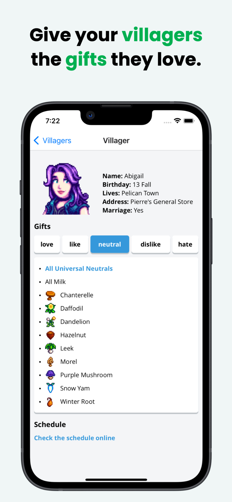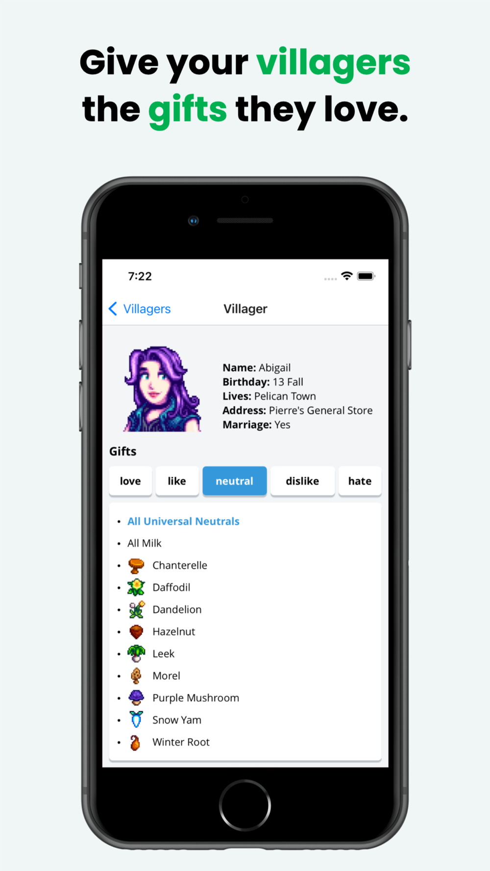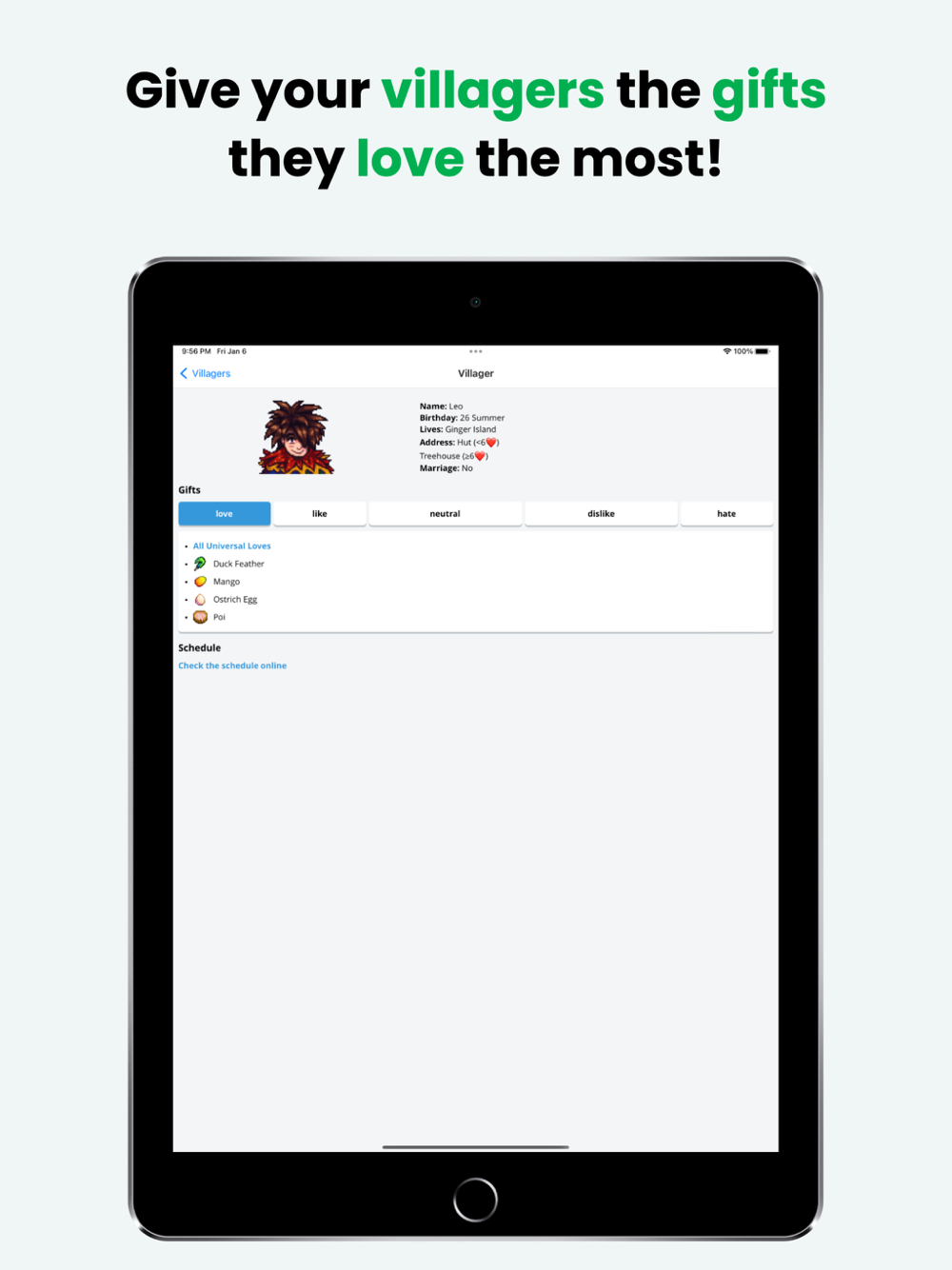 - List of Villagers, including a detailed list of all the gifts they like or hate
