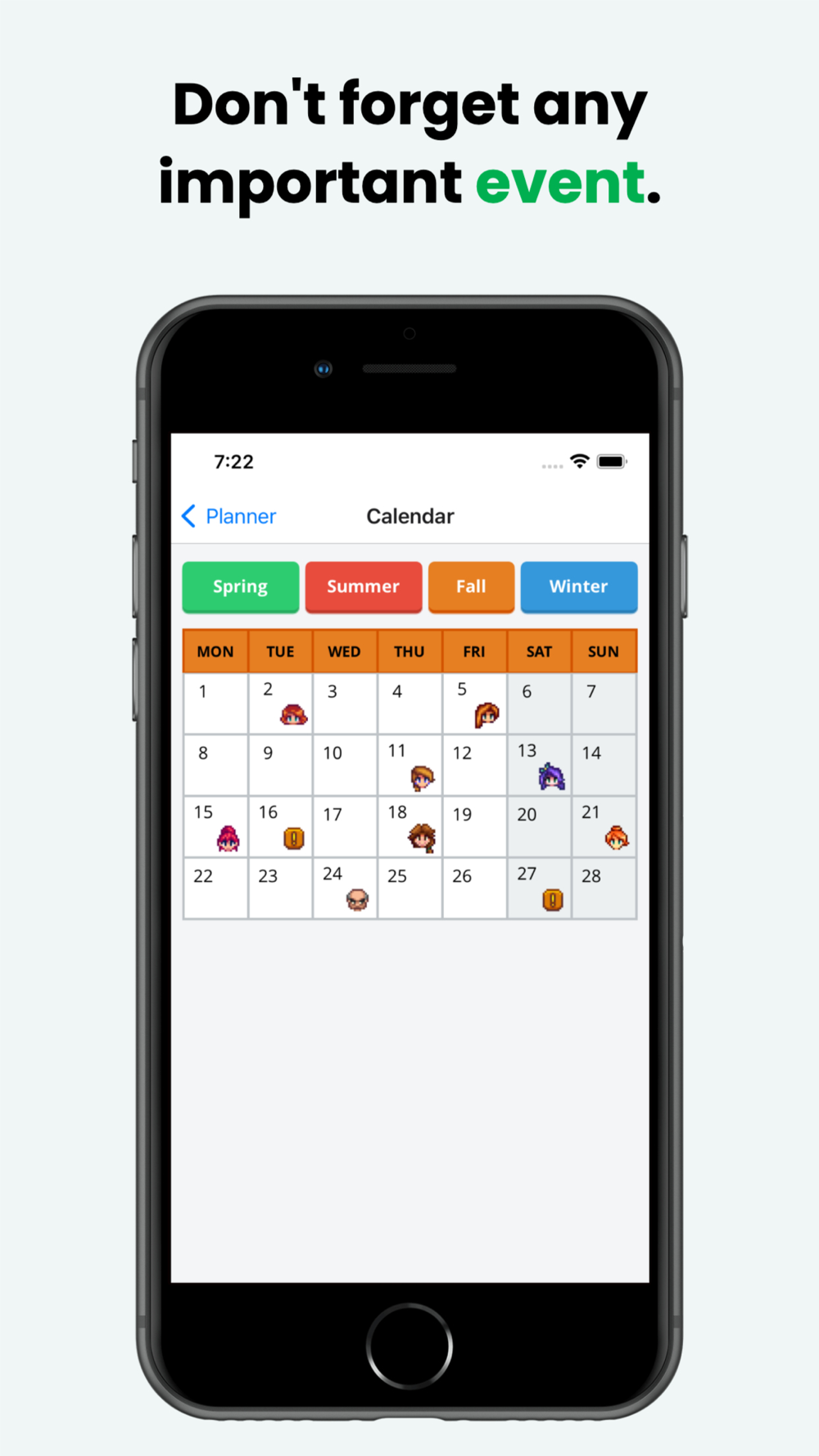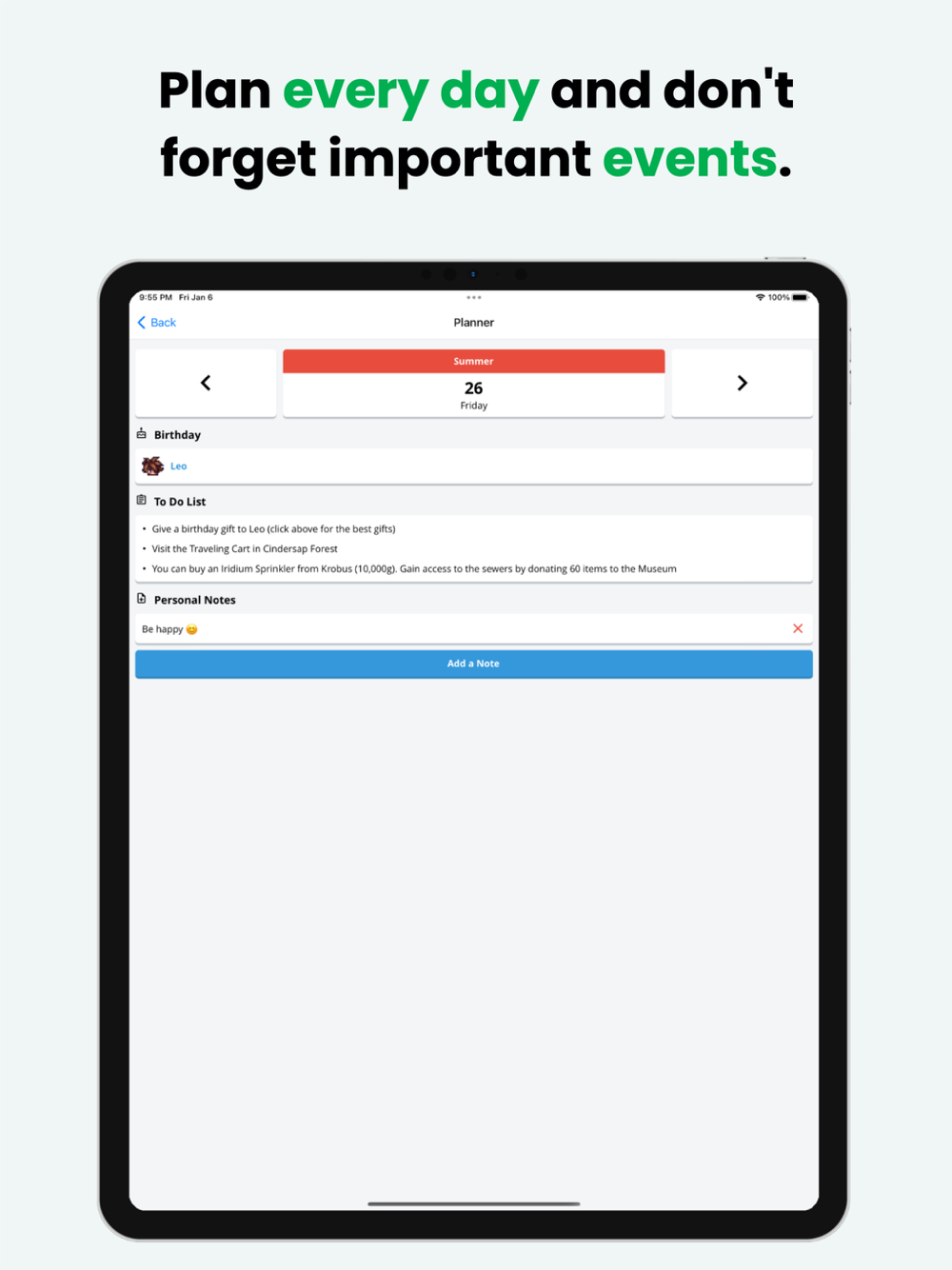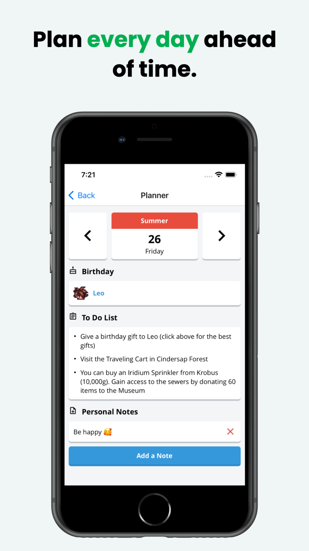 The Valley Planner will help keep track of everything you have to do along with a lot of important informations that you'll need on your daily farming, including: