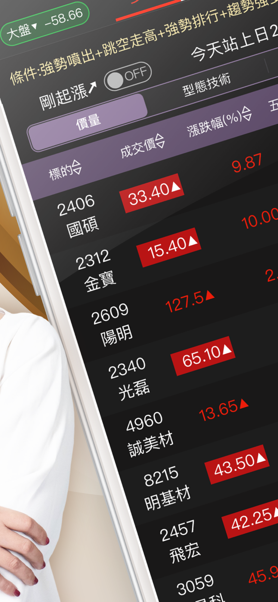 《強棒旺旺來APP》提供操作當沖、波段的投資人每日具有起「漲噴發訊號」的股票清單,內建多空技術分析選股策略,打開APP就能馬上查看當日最熱門的強勢股、弱勢股。主策略包含4大技術型態條件: