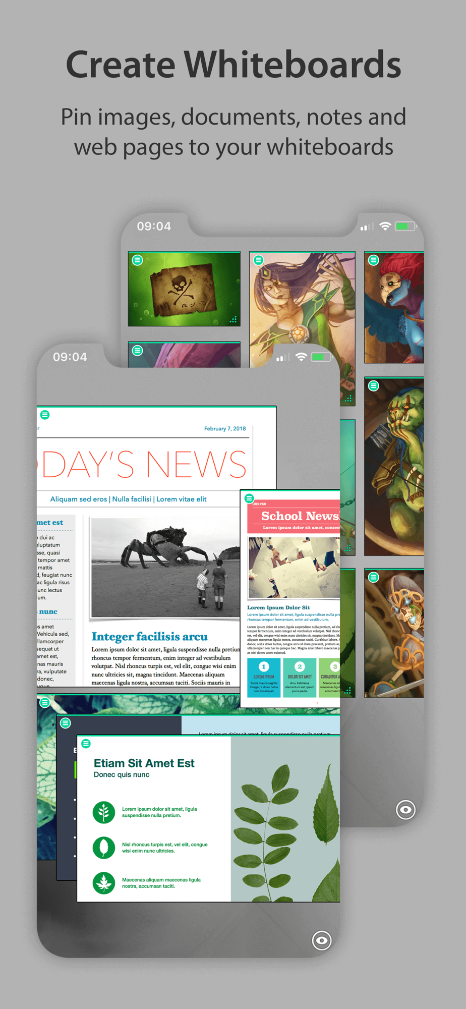 Easily pin documents, PDFs, images, web pages, notes and drawings to your whiteboards. Save each whiteboard as a project. Great for collecting research, mood boards or references.