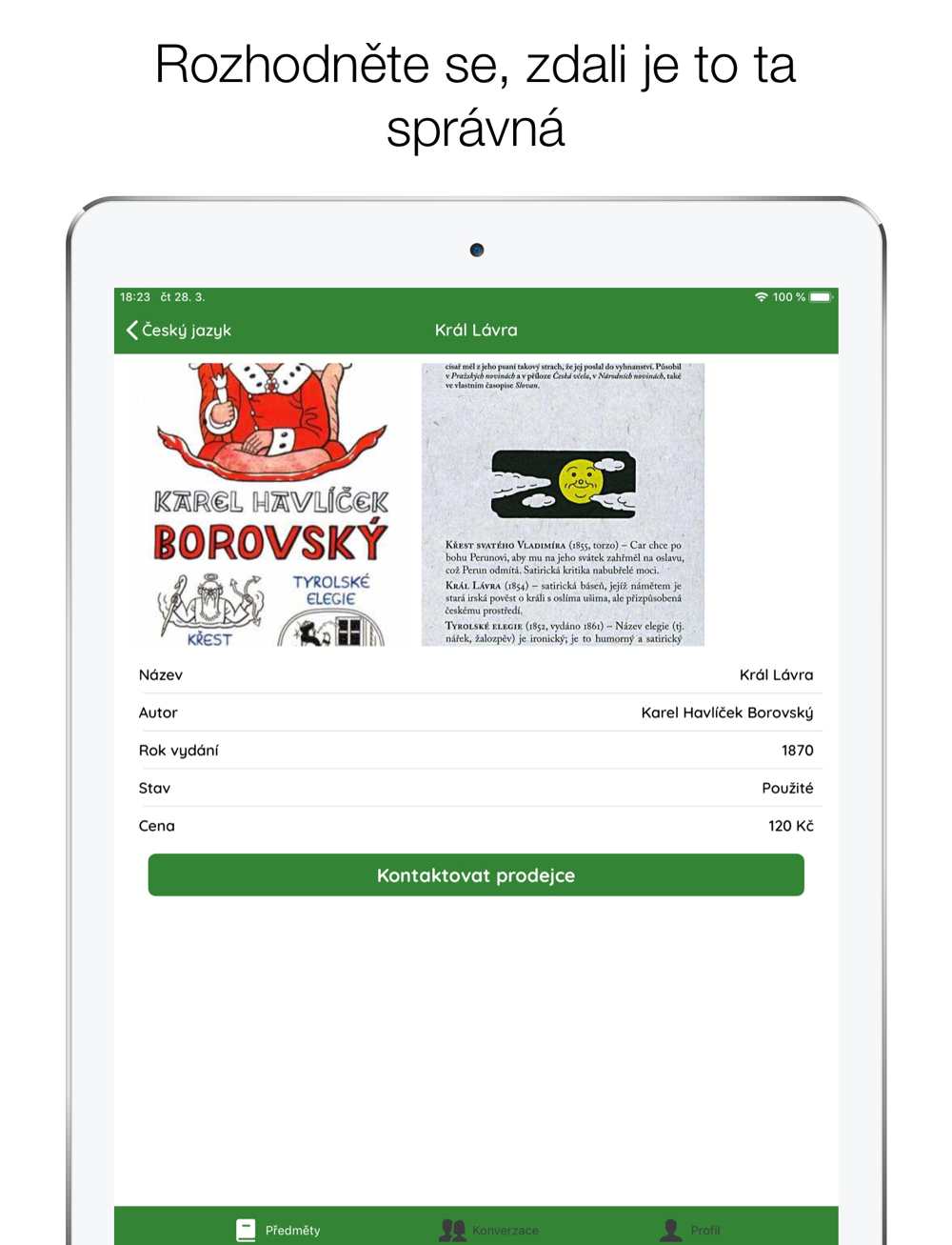 Vyberte si předmět, který se vyučuje na vaší škole a jednoduše hledejte učebnici o kterou máte zájem. V detailu učebnice uvidíte - název učebnice, cenu, rok vydání, stav a fotky učebnice. Jestliže se vám učebnice líbí, stačí kliknout na tlačítko Kontaktovat prodejce a přesunete se k chatování si s prodejcem a domlouvání místa prodeje.
