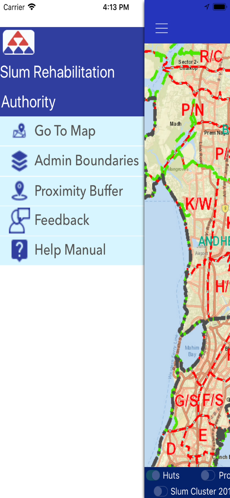 been created.This encompasses layers containing boundaries of District,Taluka,Ward,Village,Slum Cluster,SR Schemes,Huts,etc. This GIS Mobile App is developed with the support of Utility Mapping Division of NIC,New Delhi