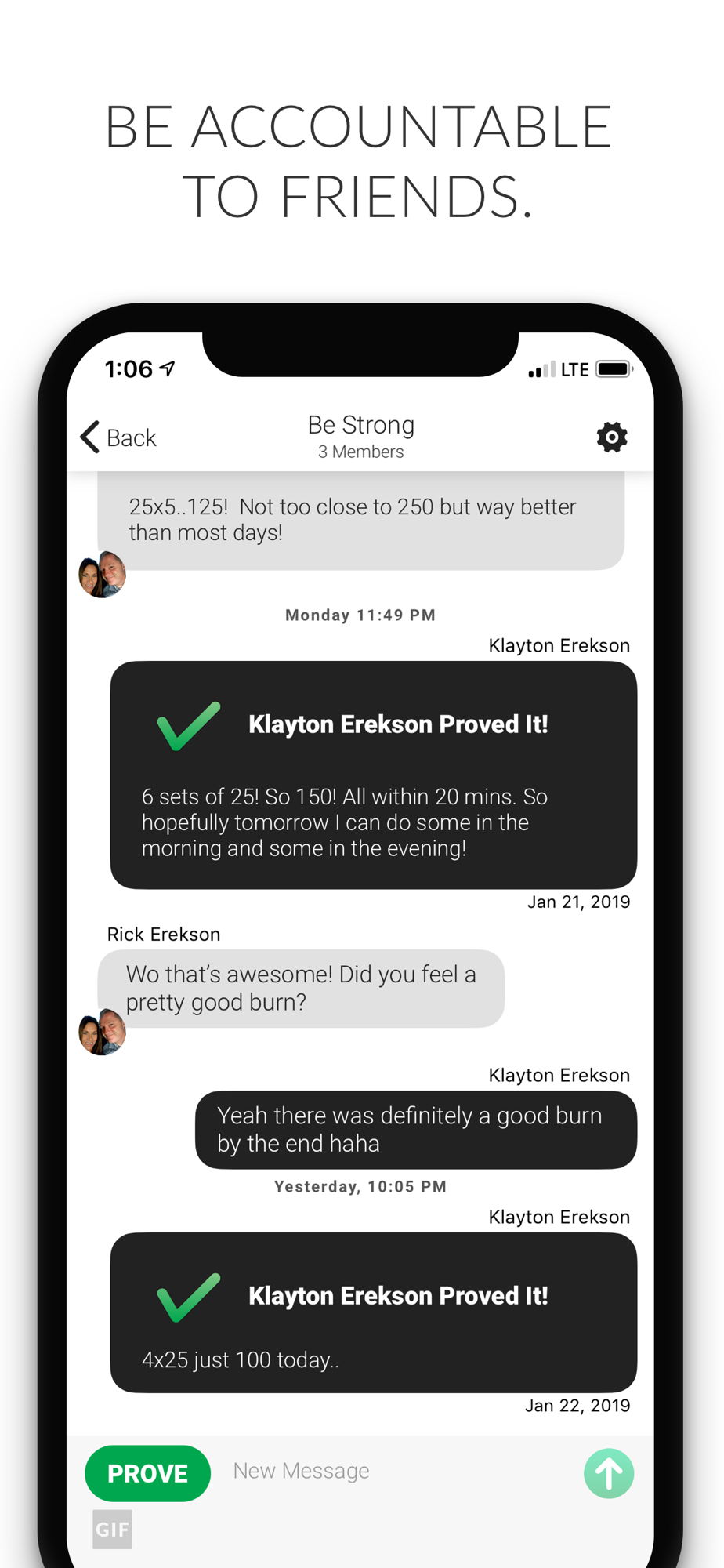 When creating your group you can customize the way you prove it. With a simple button tap, or the ability to upload a response or image, there are endless possibilities with Prove!