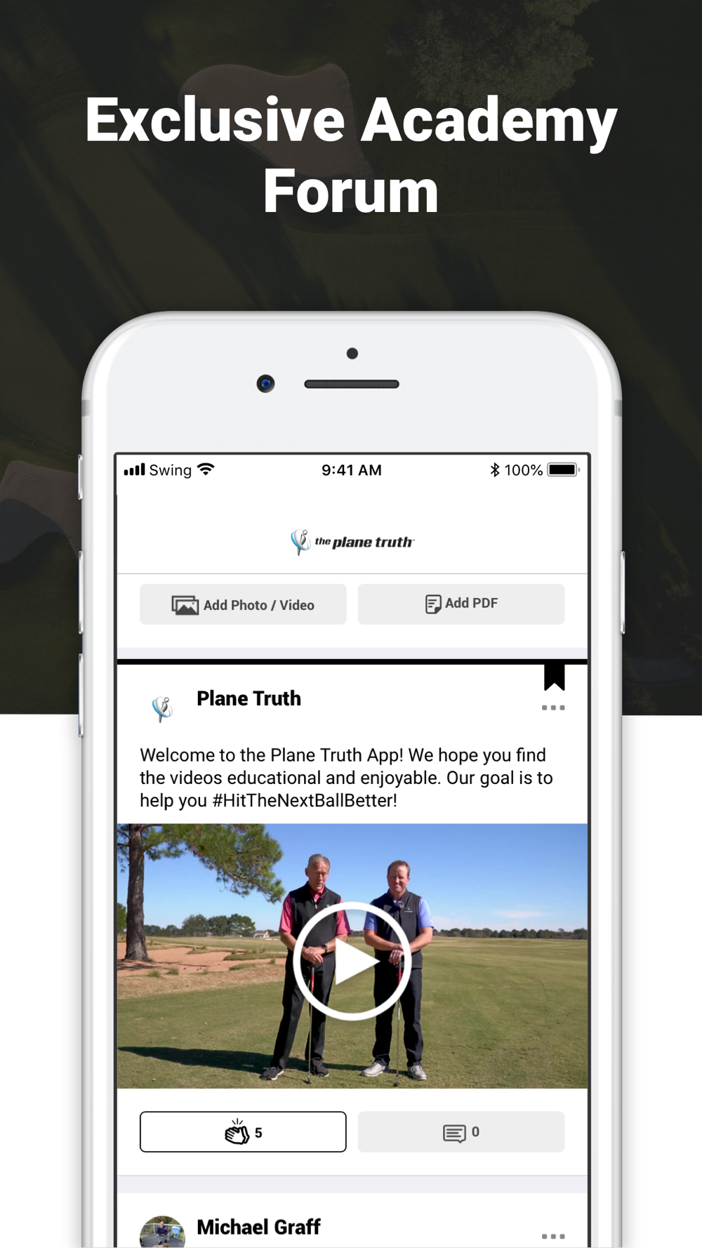 Academy Forum: social feed where Plane Truth Golf instructors share VIP content, and students share photos and videos about their golf games, training and progress with the entire online academy