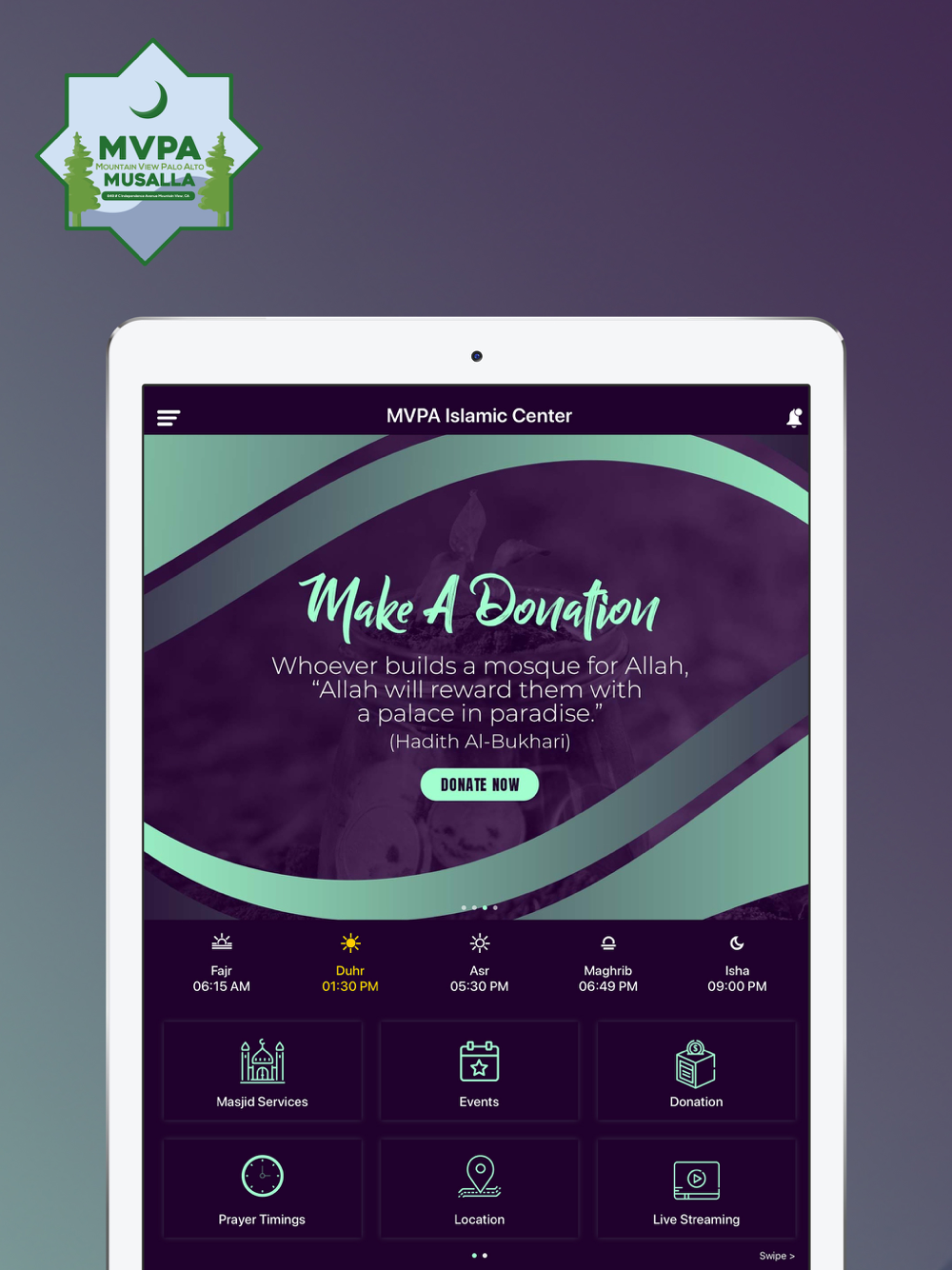 MVPA Islamic Center presents its inaugural iOS app which is also accompanied by iWatch app. Some features that the app includes are as follows: