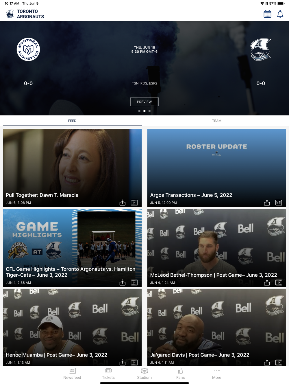 Introducing the app of the Toronto Argonauts. Follow games live with real-time scores, play-by-play updates, and player stats. Stay current with the latest Argos news, stats, schedule, and league standings. Download for free to unlock exclusive benefits, mobile ticketing, access and upgrades, and more.