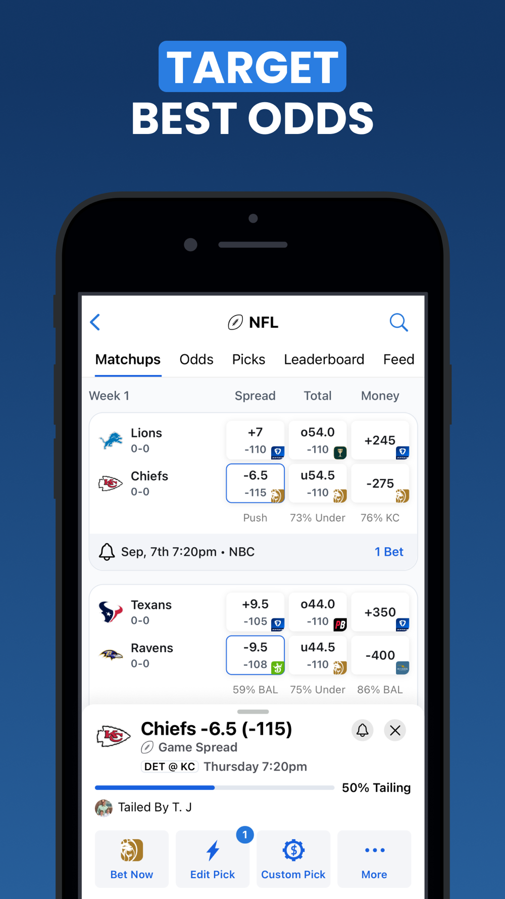 • Target the best odds and lines aggregated from all of the top sportsbooks, including FanDuel Sportsbook, DraftKings Sportsbook, and BetMGM.