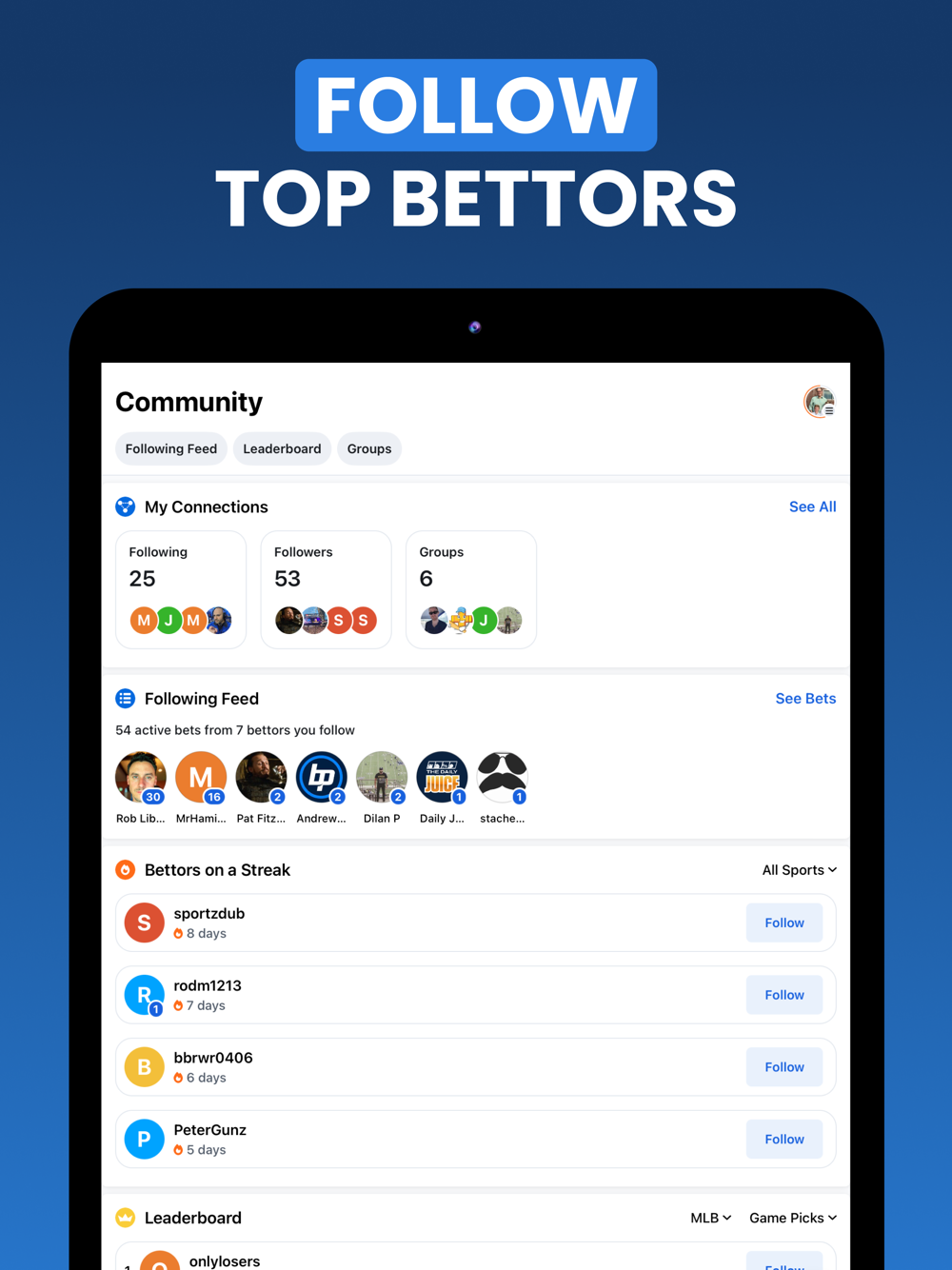 • Create and join groups, tail bets in the feed, browse members, and follow top bettors in the leaderboards.