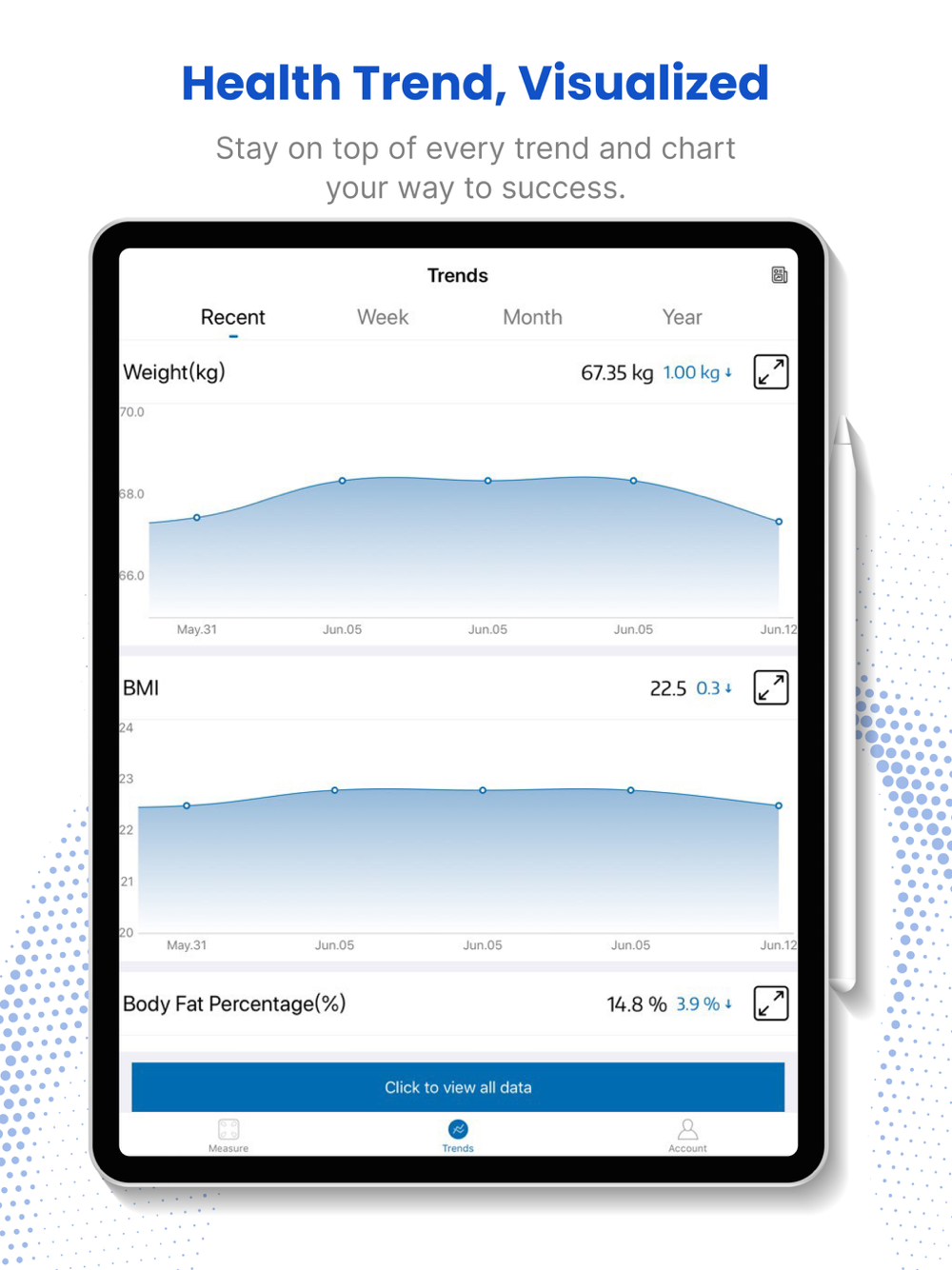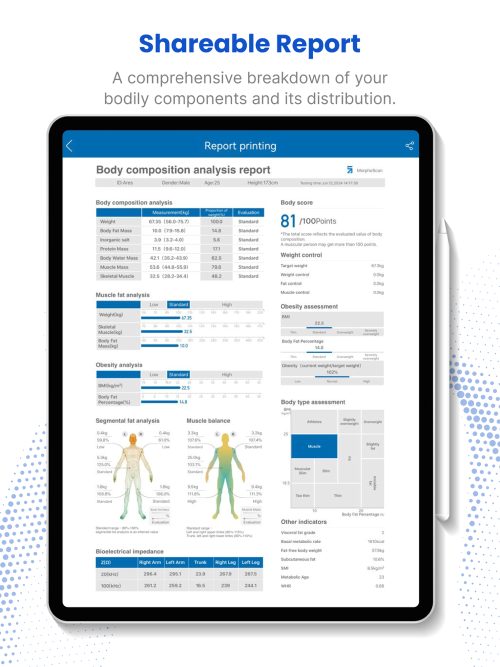 MorphoScan is the best helper in your journey to becoming fitter. The app can track multiple body composition metrics (BMI, Body Fat %, Body Water, Bone Mass, Basal Metabolism Body Age, Muscle Mass, etc). The cloud-based App’s intelligent data analysis and tracking abilities makes it your perfect digital personal helper. It can even convert your data stored over time into charts and reports that can easily be shared by e-mail and multiple social media channels. On top of all that,we can sync your data to Apple Health,and your entire family can use the App! MorphoScan allows the user to create multiple personal profiles to keep your data separated.