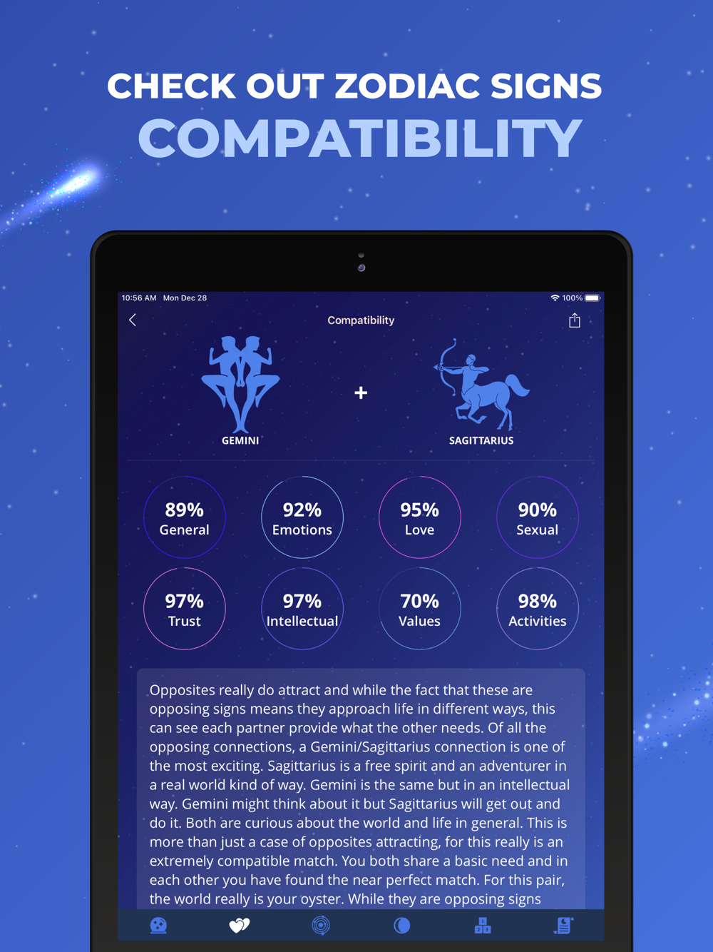 An accurate personal horoscope, zodiac compatibility, biorhythm chart, full numerology prediction, moon phases report and even daily planetary overview - ALL in ONE app! To make sure reports are accurate, we generate them based on your birth date and full name. Astrology is very powerful way for self-discovery, for understanding others and the world around us!