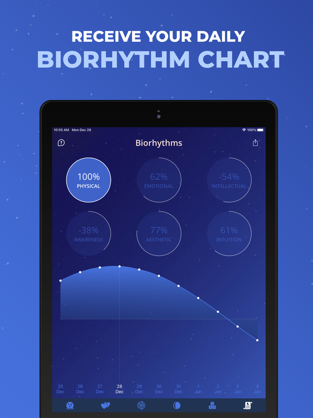 We all sometimes have good days and bad days. Looking at your personal Biorhythm Chart you can find out about them in advance without even reading a word.