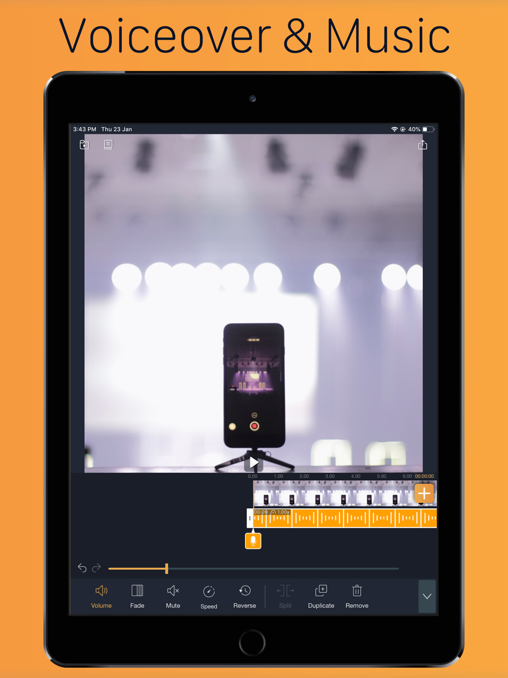 • Video editor with music and photo and text enable you to record a voice over for your videos and place your VoiceOver on timeline to sync the actions.