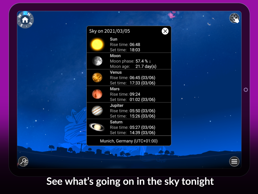 Which star is this? Where do I find Mars? Is it the ISS up there? Hold your smartphone or tablet up to the sky and see which planets, stars, or constellations are above you.