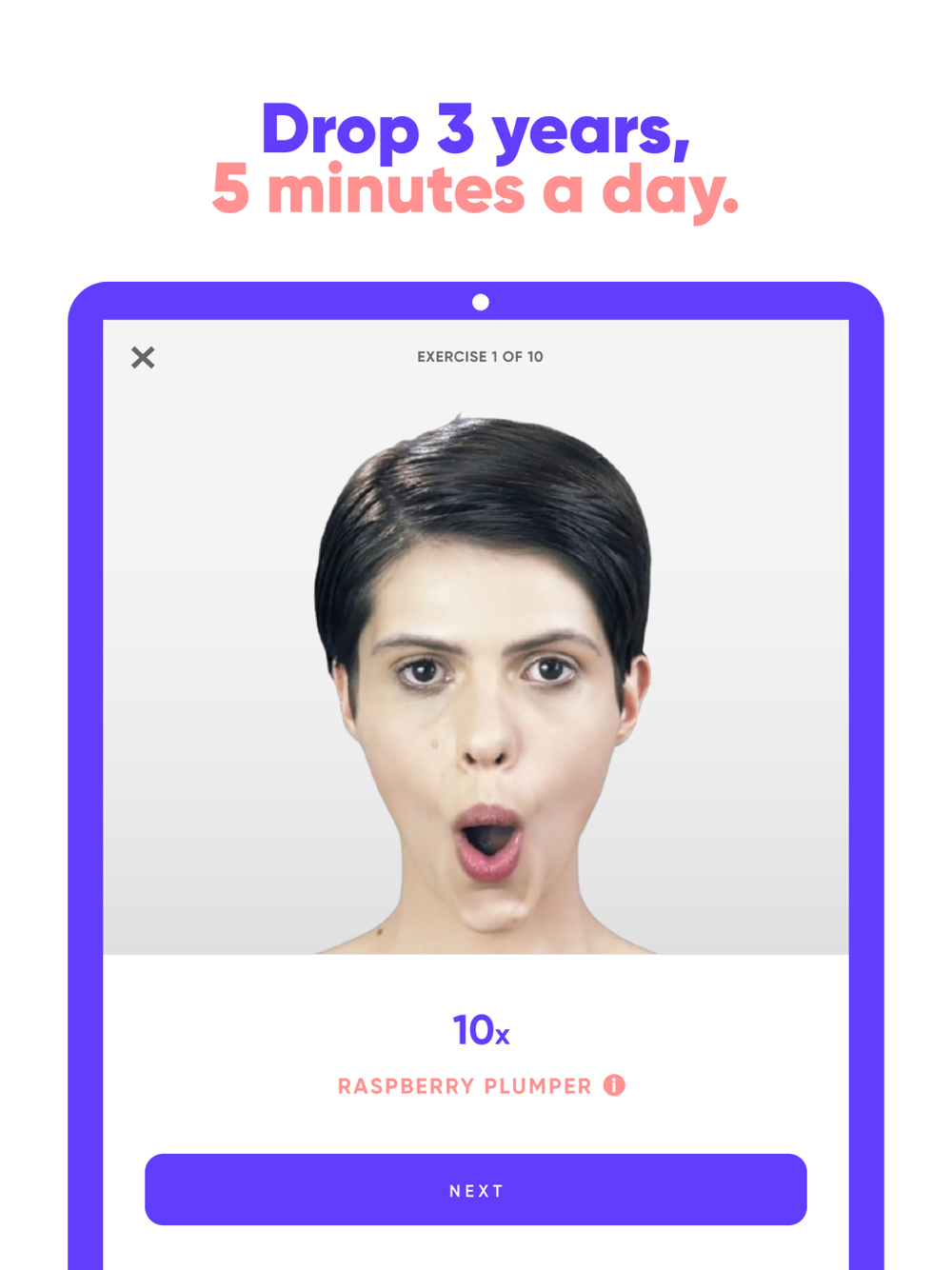Face Exercises is free to download, and the daily workout with mandatory rest times is free. A subscription is required for unlimited access to all workouts and to skip rest times.