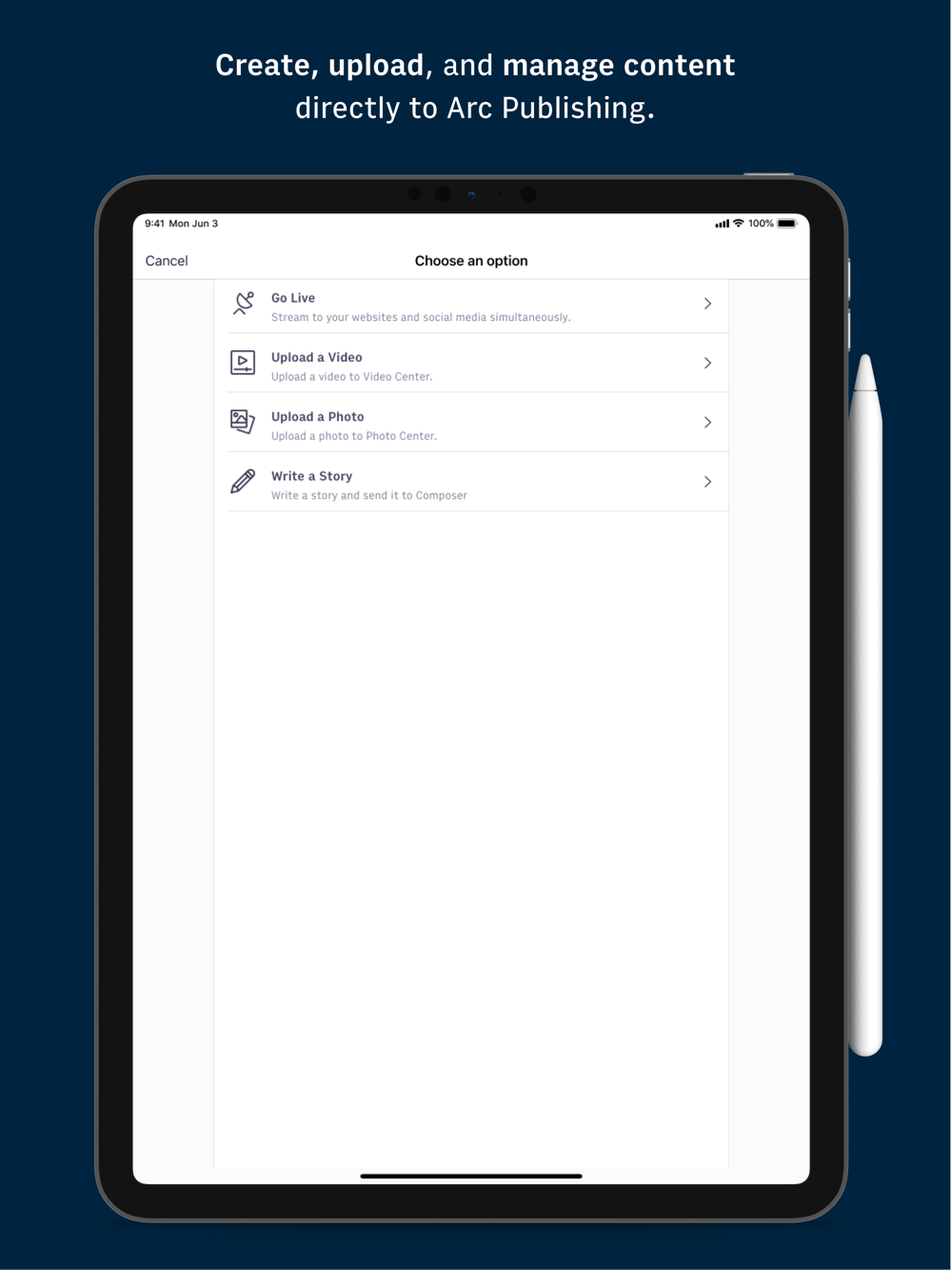-Collaborate with your team leveraging the Arc Publishing platform. You can create live streams in the field, or record a video from your phone and upload it to the Arc platform. Your coworkers can access your stream and videos from the web.