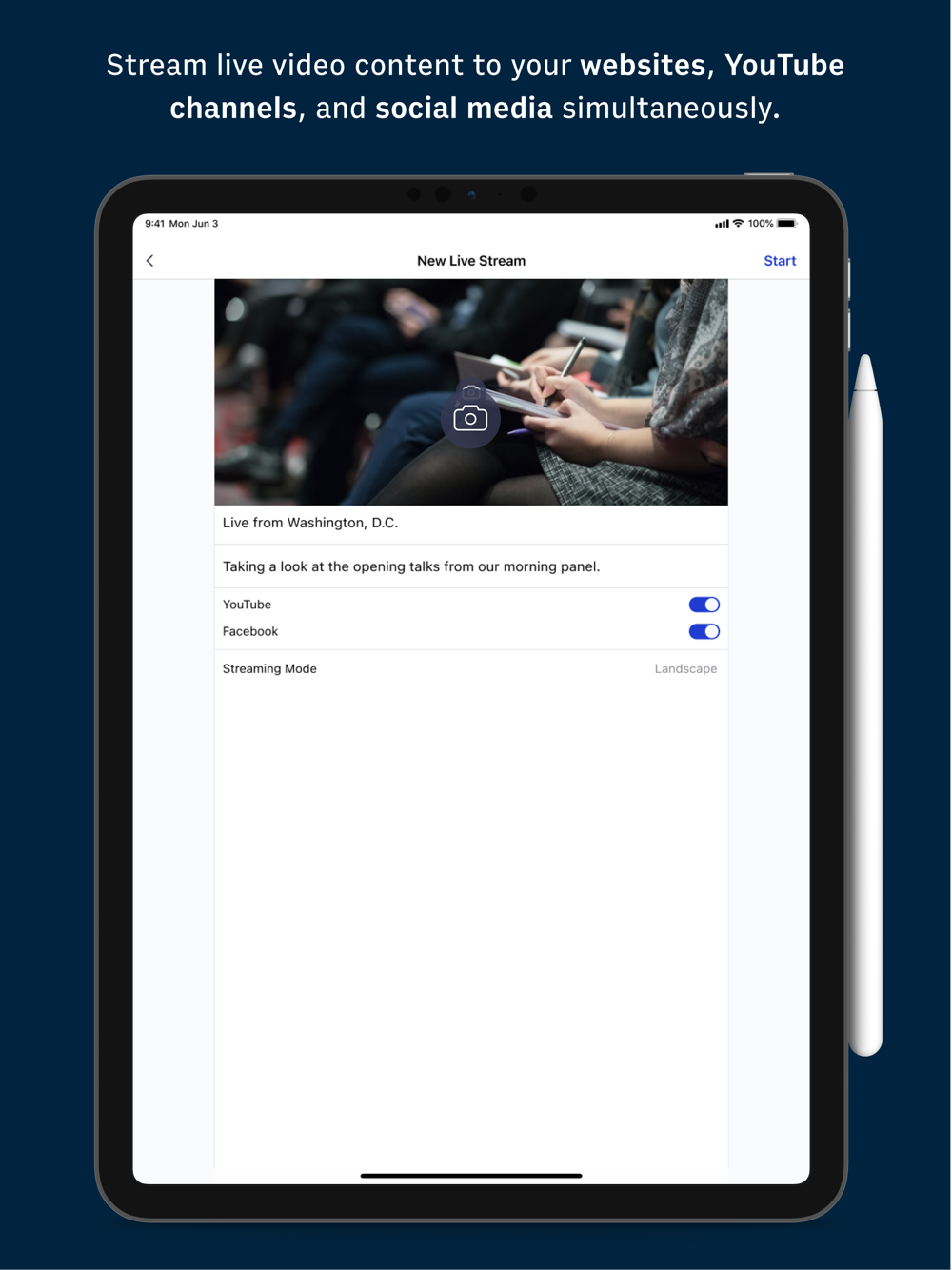 -On the campaign trail, during breaking news, or at an event -- no matter the situation -- you can live stream immediately without any special equipment.