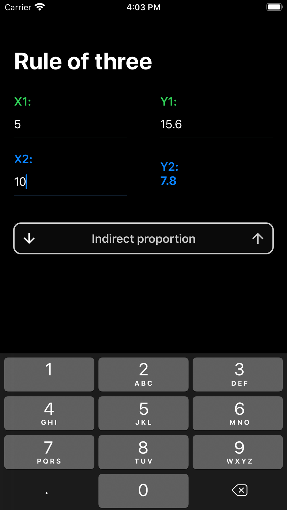 Simple calculator for the Rule of Three. Supports for both direct proportion and indirect proportion mode.