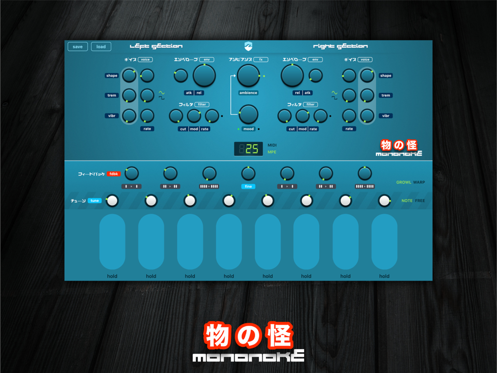 The synthesizer engines (each of the two sections has its own independent engine) have relatively simple controls, which influence a complex system of many invisible, interconnected LFOs. But this is not your bread-and-butter general purpose synthesizer: think of Mononoke as one huge FM synthesizer where each voice is an independently playable operator. Together all operators contribute to a single soundscape.