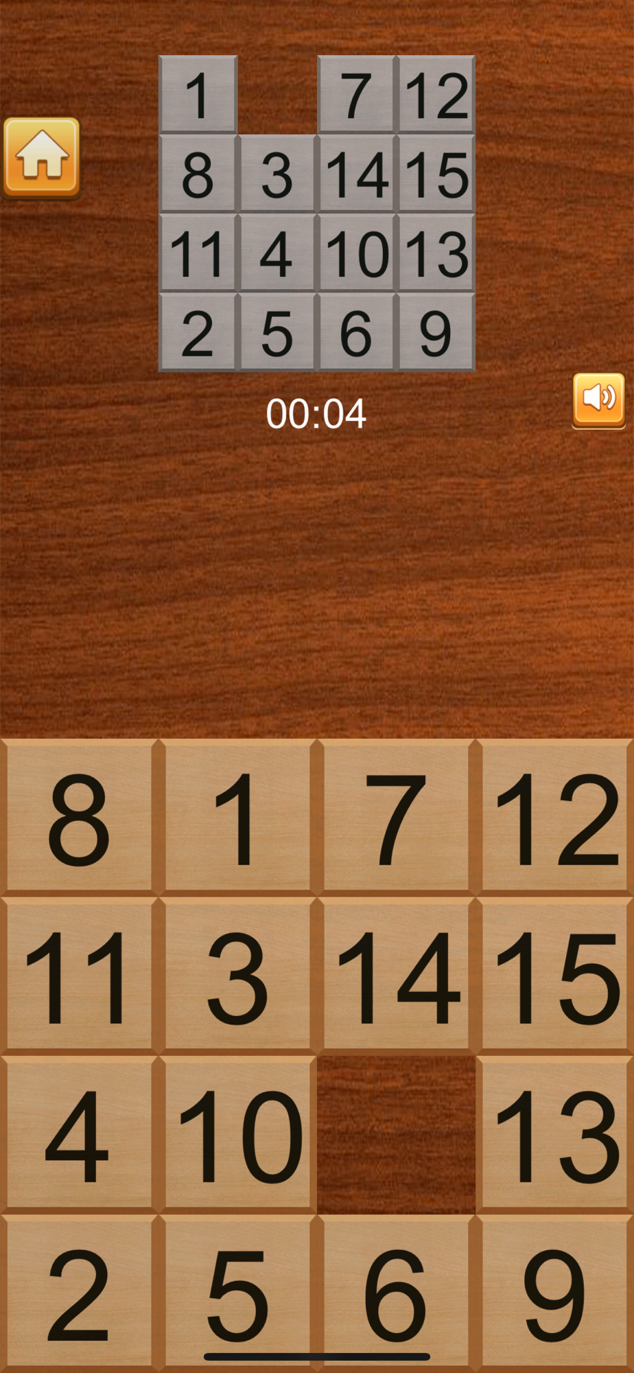 The basic form is a 3 by 3 grid. There are 15 tiles and the 16th place is empty. Before play begins the tiles are randomly scrambled by sliding to any starting position. Tap and move the wood number tiles. The object of the game is then to unscramble the tiles to get them into consecutive order.