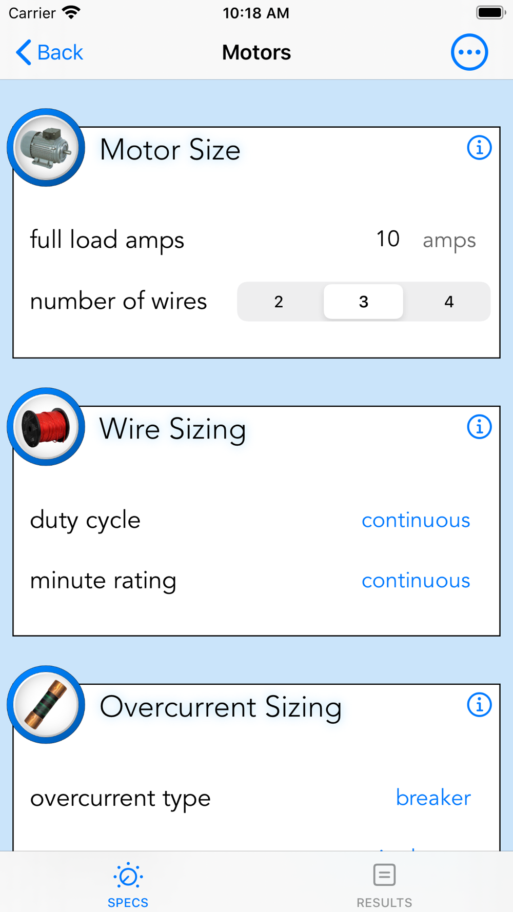 - Calculate any motor load and get maximum overcurrent, maximum overload, minimum wire, minimum pipe, and minimum bond wire size.