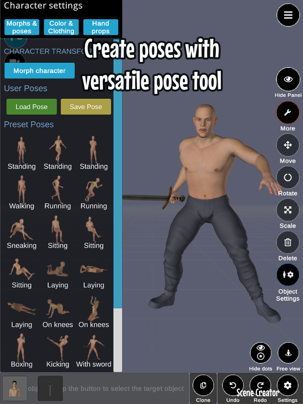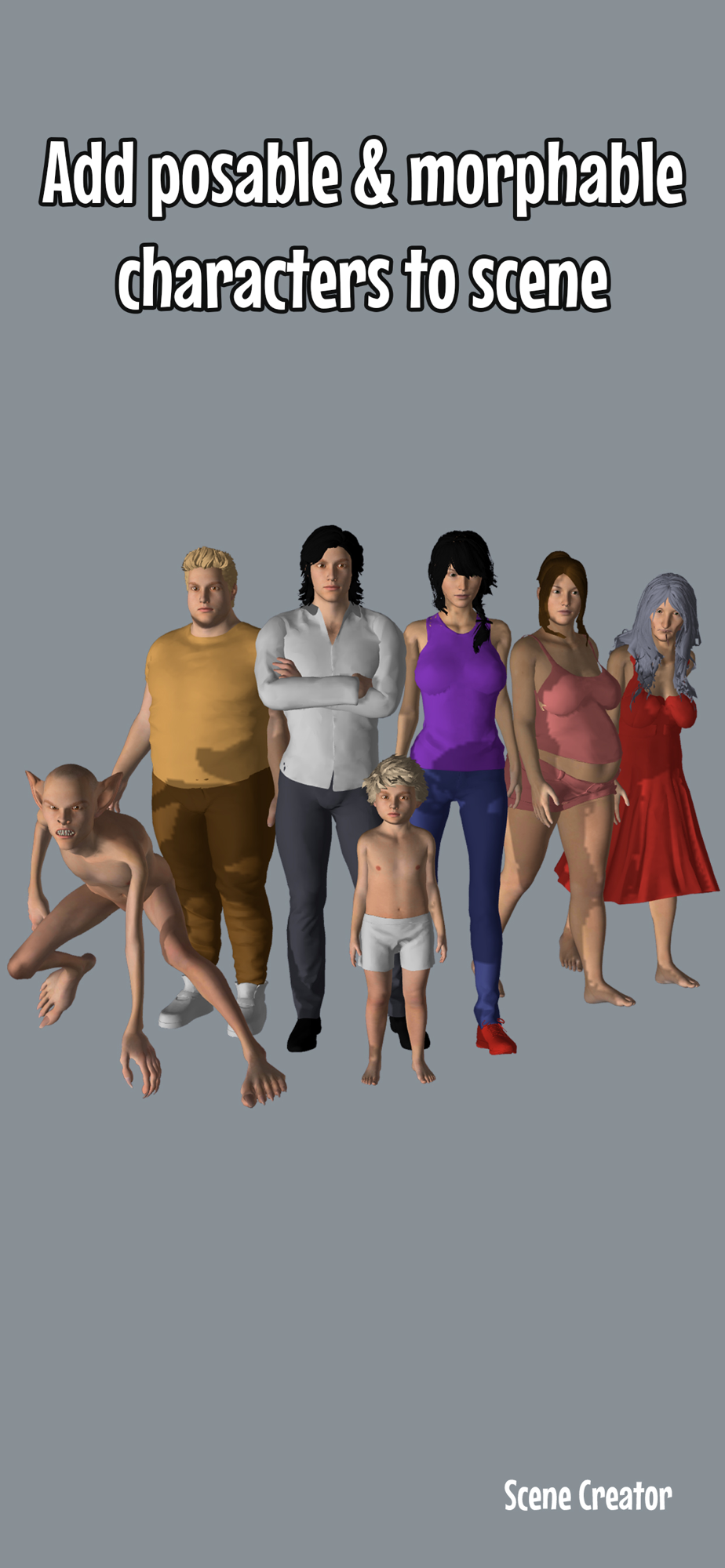 Scene Creator comes with powerful pose editor. You can pose realistic human models and animals (horse, dog and cat). Create thousands of unique characters with our powerful morphing system. Our base male and female models comes with hundreds of individual morphs, that allow you to create your own truly unique characters. You can transform your model from child to an adult, skinny to muscular or make it fat, pregnant, creature etc. App comes with wide variety of 3D objects that you can add to your scenes. Choose from weapons, vehicles, furniture, plants or from primitive shapes.