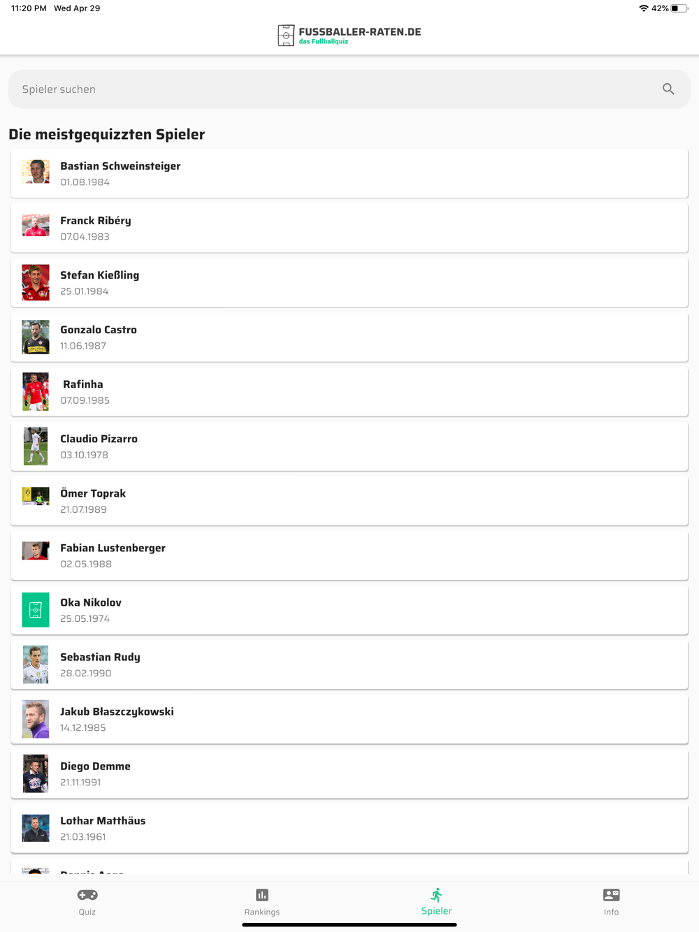 Teste dein Wissen und werde Quiz-Champion. Beim Fußball-Quiz von fussballer-raten.de werden dir die Vereine, absolvierte Spiele und geschossene Tore von 15 verschiedenen Profi-Fußballern gezeigt - du musst erraten, wer sich dahinter versteckt. Du kommst nicht direkt darauf? Dann hast du die Wahl aus drei verschiedenen Jokern. Der Vorname, ein Bild oder ein Buchstabe werden dir weiterhelfen.