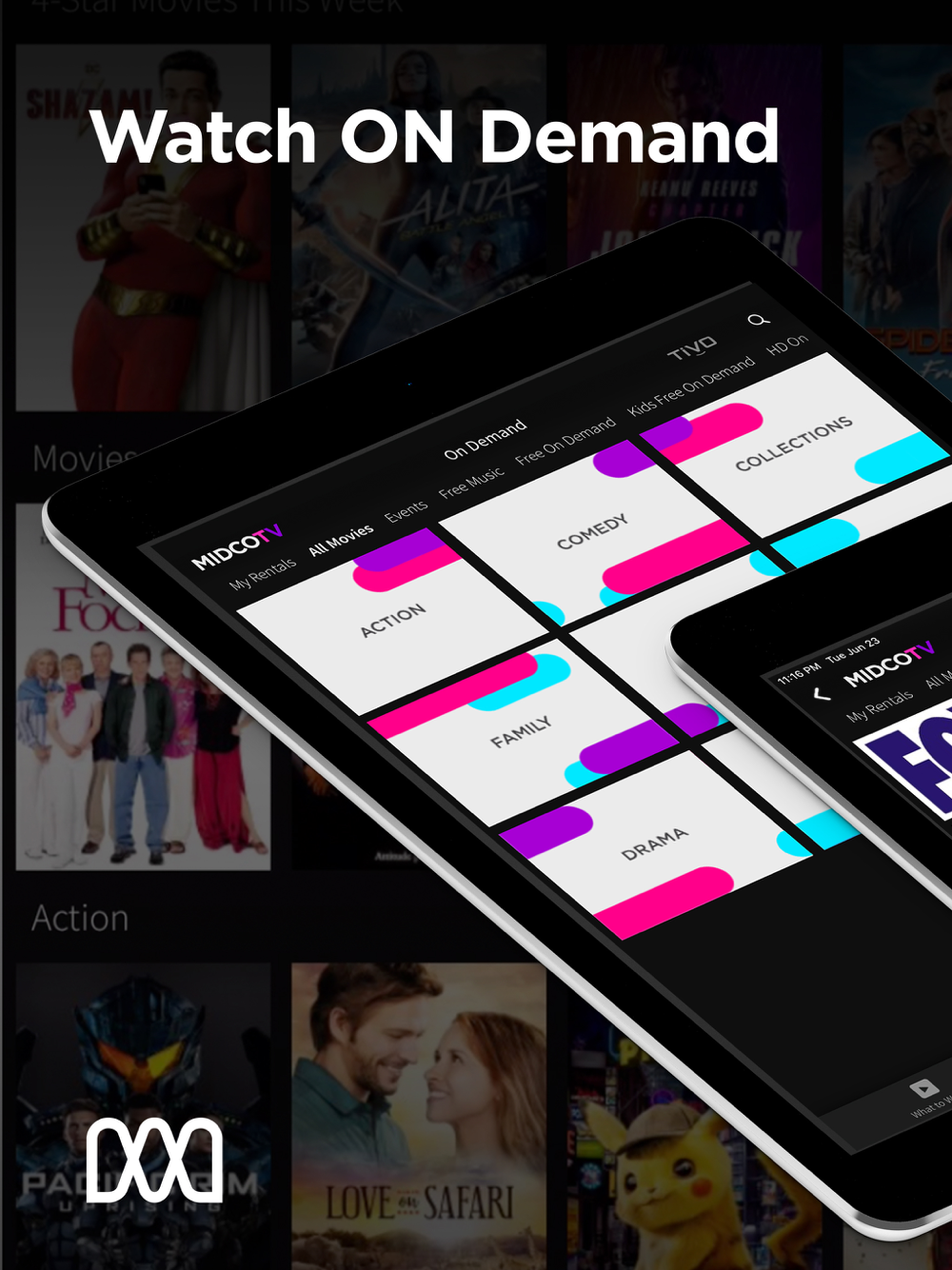After connecting MidcoTV equipment to your TV, download the MidcoTV app. When you're on your home network, you can stream live TV, recordings from your cloud DVR, ON Demand content and more on your device, so everyone can watch what they want (up to three streams at once!). Plus, you can schedule and manage your recordings from anywhere and access TV Everywhere networks to watch more shows.
