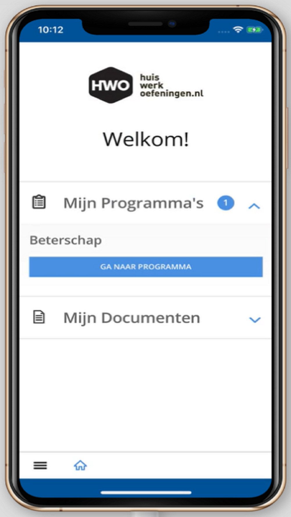 Met de HWO-app kunt u uw oefenprogramma altijd en overal raadplegen op uw telefoon. Zodra u deze app op uw telefoon hebt geïnstalleerd, hoeft u alleen maar in te loggen in de app met de toegangscode die u van uw zorgaanbieder hebt ontvangen.