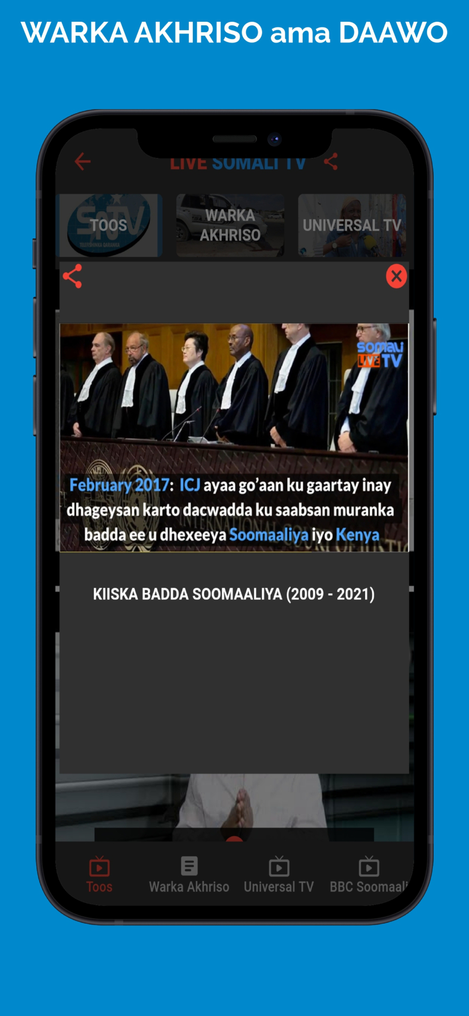 Watch the best Somali TV content, all in one place with shows from Universal, Horn Cable, Somaliland, Jubbaland, Puntland, Galmudug, Kalsan, Dalka, Af Soomaali, Somali Kitchen recipes and more with no Ads or sign in.