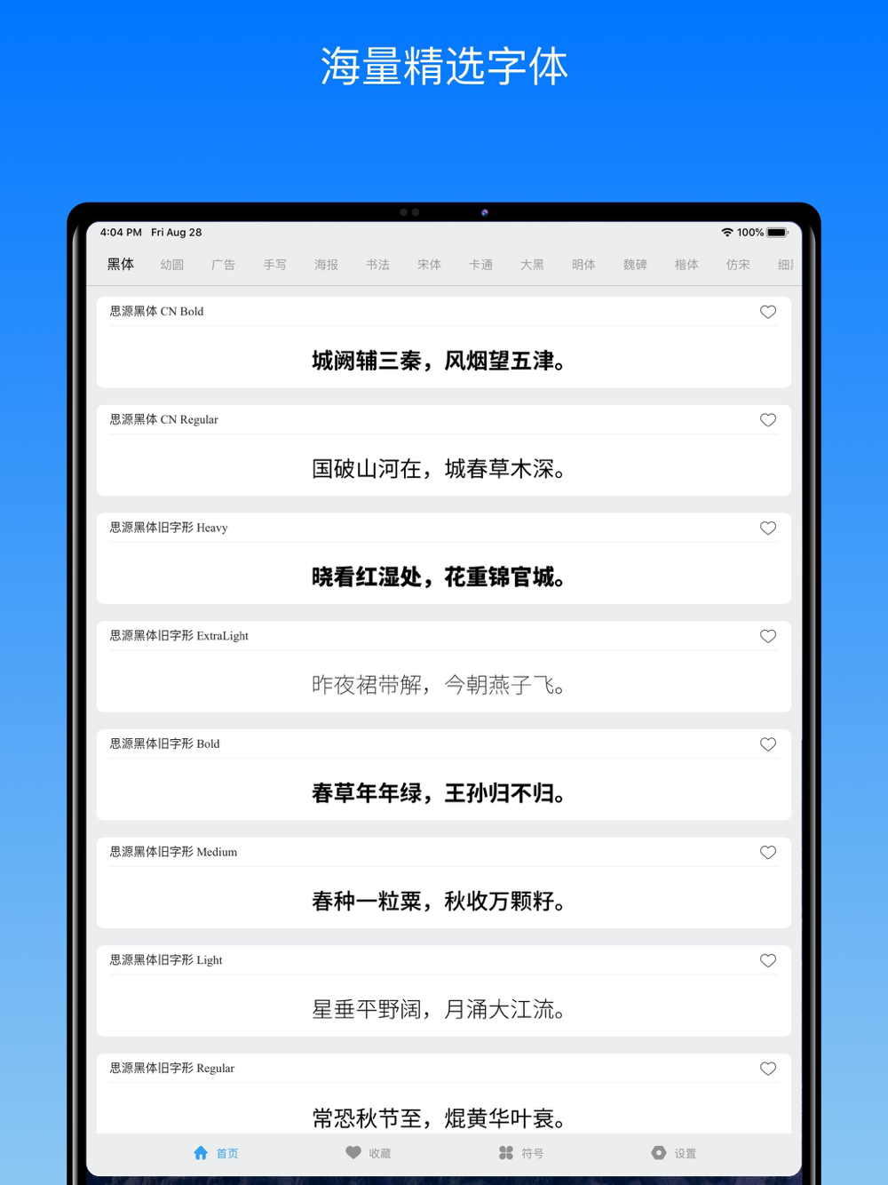 快来试试字体册吧,精选数百款精美字体,一键安装到iPhone系统,无需安装描述文件,手机小白也能轻松搞定字体安装。安装的字体可以在第三方app中使用,让你的手机不再单调。