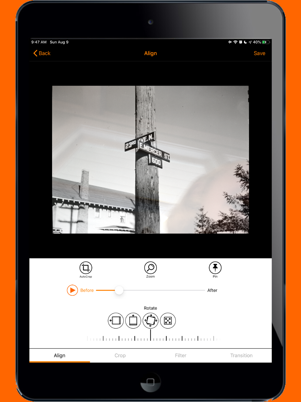 Create amazingly aligned before & after image animations. TimeWarp makes it easy to capture an 'after' image from the exact same position as your 'before' image by providing an overlay of the 'before' image in the camera view finder. Once captured, you can further refine your alignment using the intuitive alignment and cropping tools. Then generate videos with customized transitions such as dissolve, swipe, spread, and cut. You can also apply color filters to your images separately.