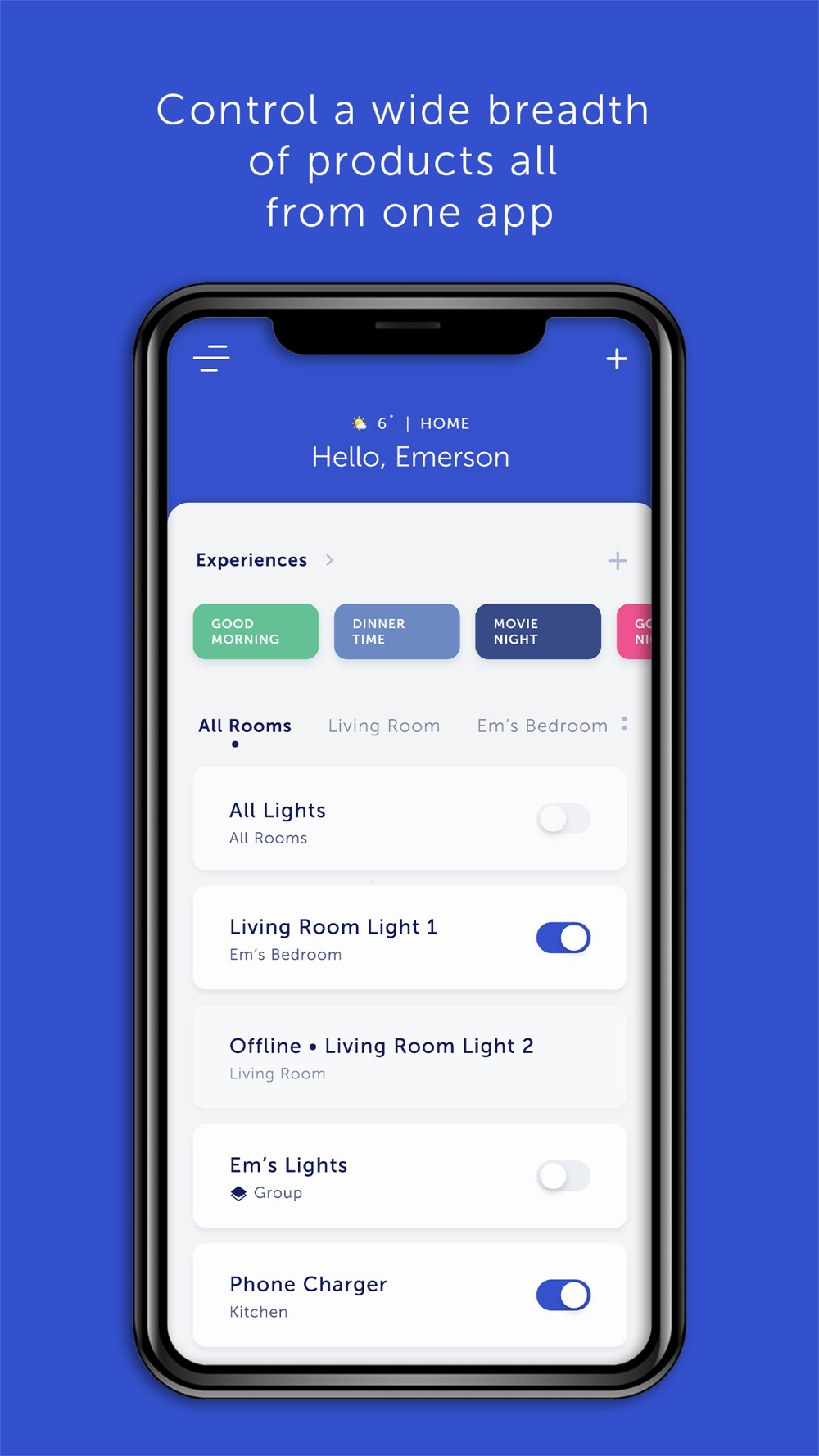 - Create custom Experiences to easily automate, set scheduled routines, or timers for your favorite settings (Ex: create an Experience that schedules the kitchen lights to turn off at 10 p.m. on weekdays and call it your "Good Night" Experience)