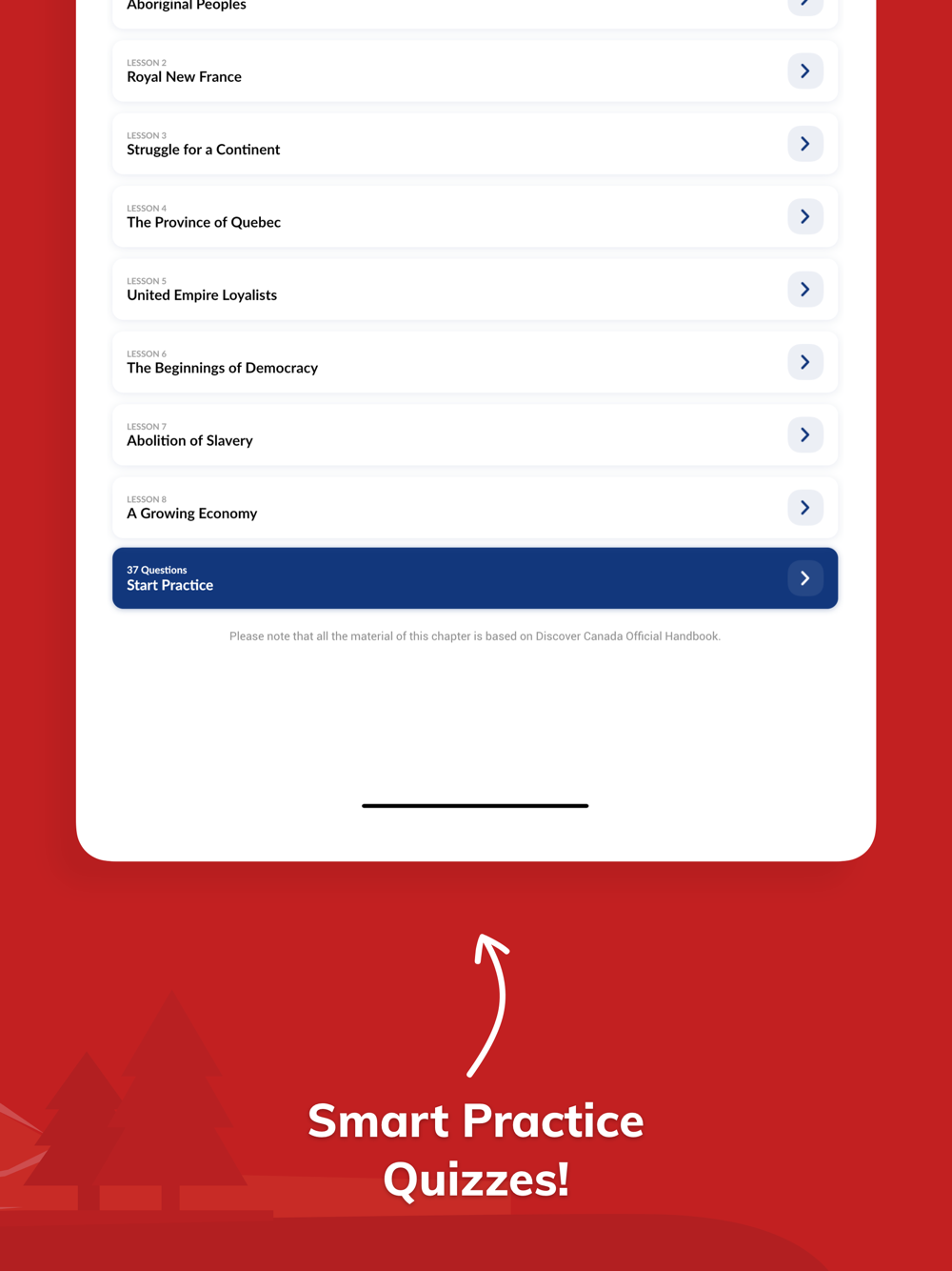 All the app's material is based on Discover Canada: The Rights and Responsibilities of Citizenship. Practice with the province-specific questions that you will be asked on the citizenship test. Get full explanations for every question.