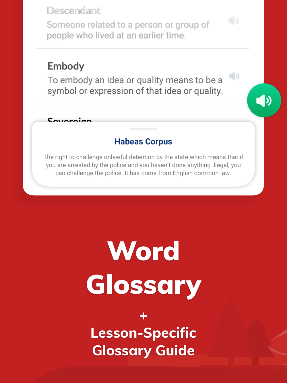 Don't know the meaning of a word? No worries! Access to a full content-focused dictionary and improve your vocabulary while studying for your citizenship test.