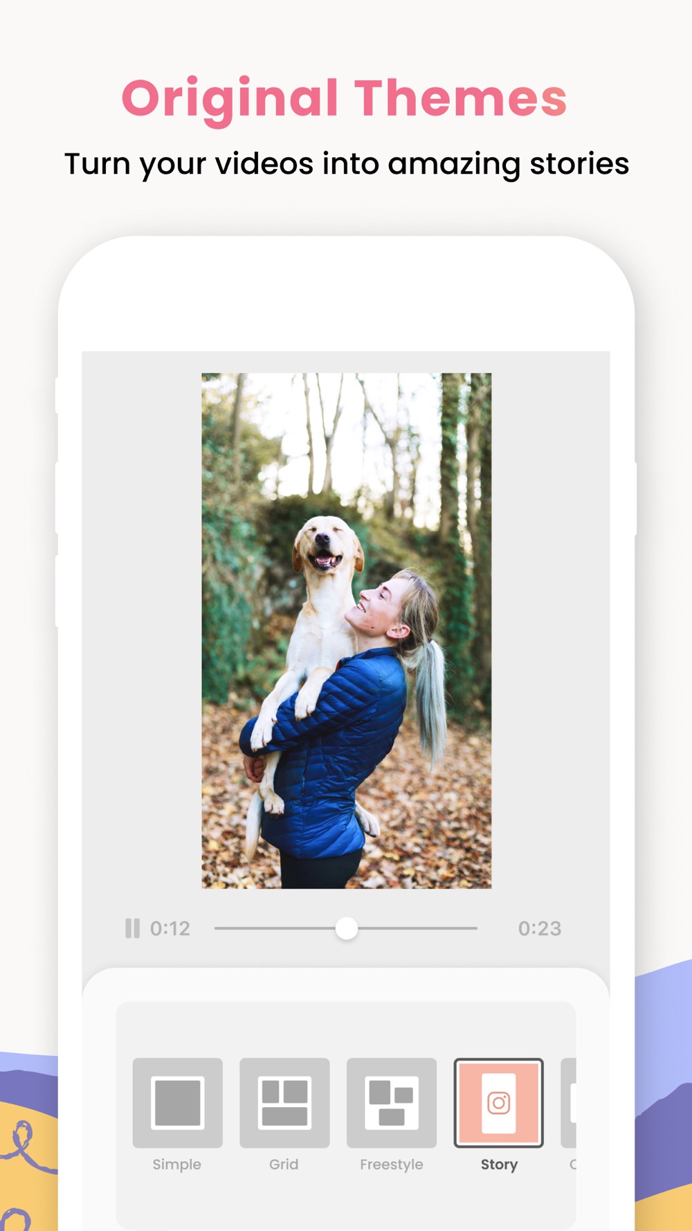 ・Original Themes: quickly transform your videos into ready-to-share stories. Each theme combines different layouts, music, and filters for a polished look.