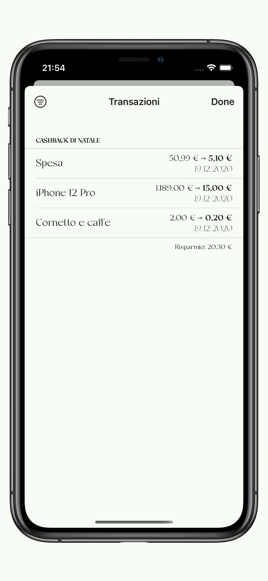 Cashback ti aiuta a tenere traccia dei tuoi acquisti e del valore del cashback di Stato. Avrai uno storico di tutte le transazioni inserite, e la somma del denaro risparmiato in un attimo, senza attese.