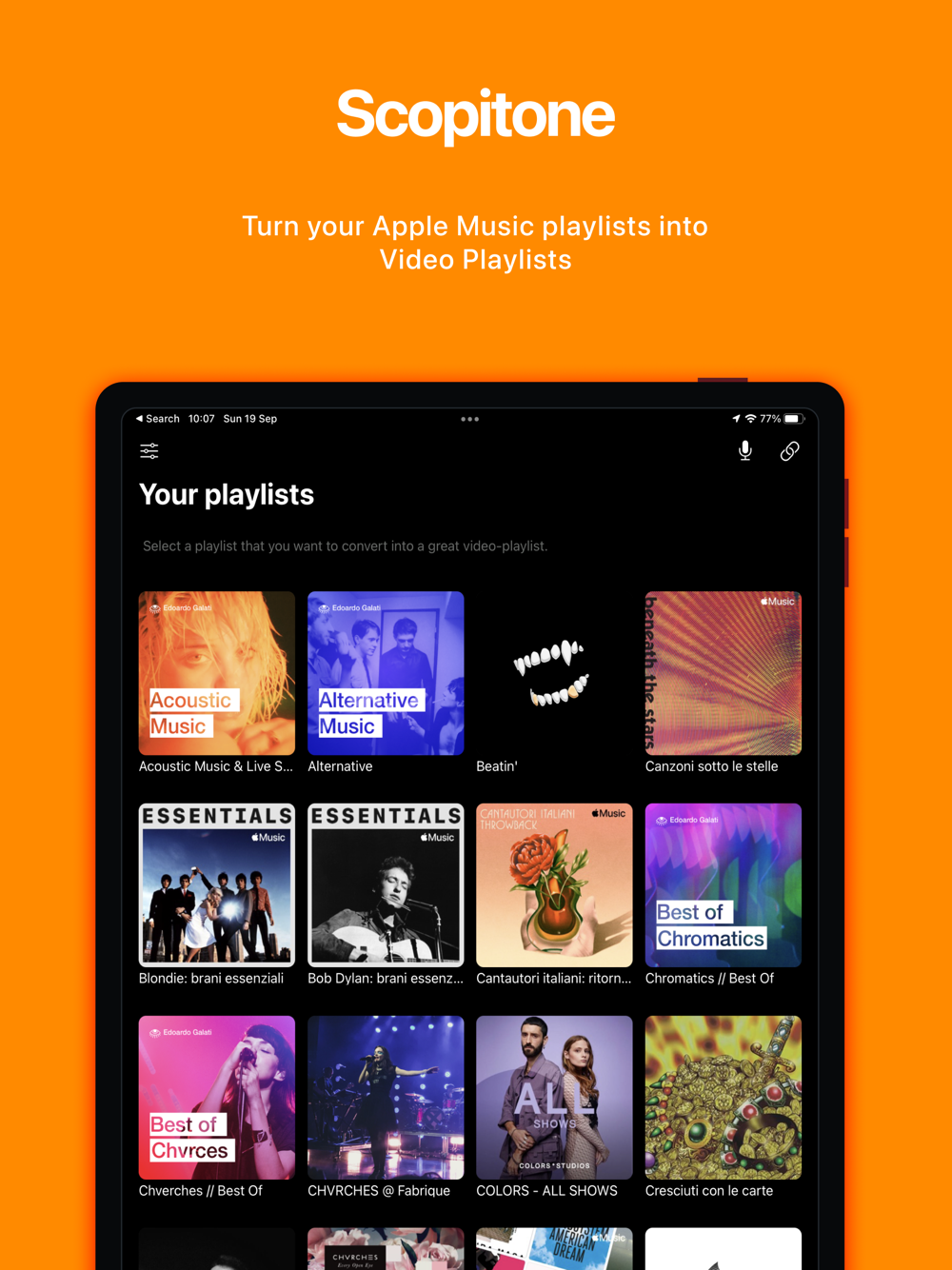 That is why we created Scopitone. Scopitone lets you create video playlists from your beautiful ones. You just select the playlist you want to convert, it searches the video for every song in the playlist, and then it lets you generate the playlist.
