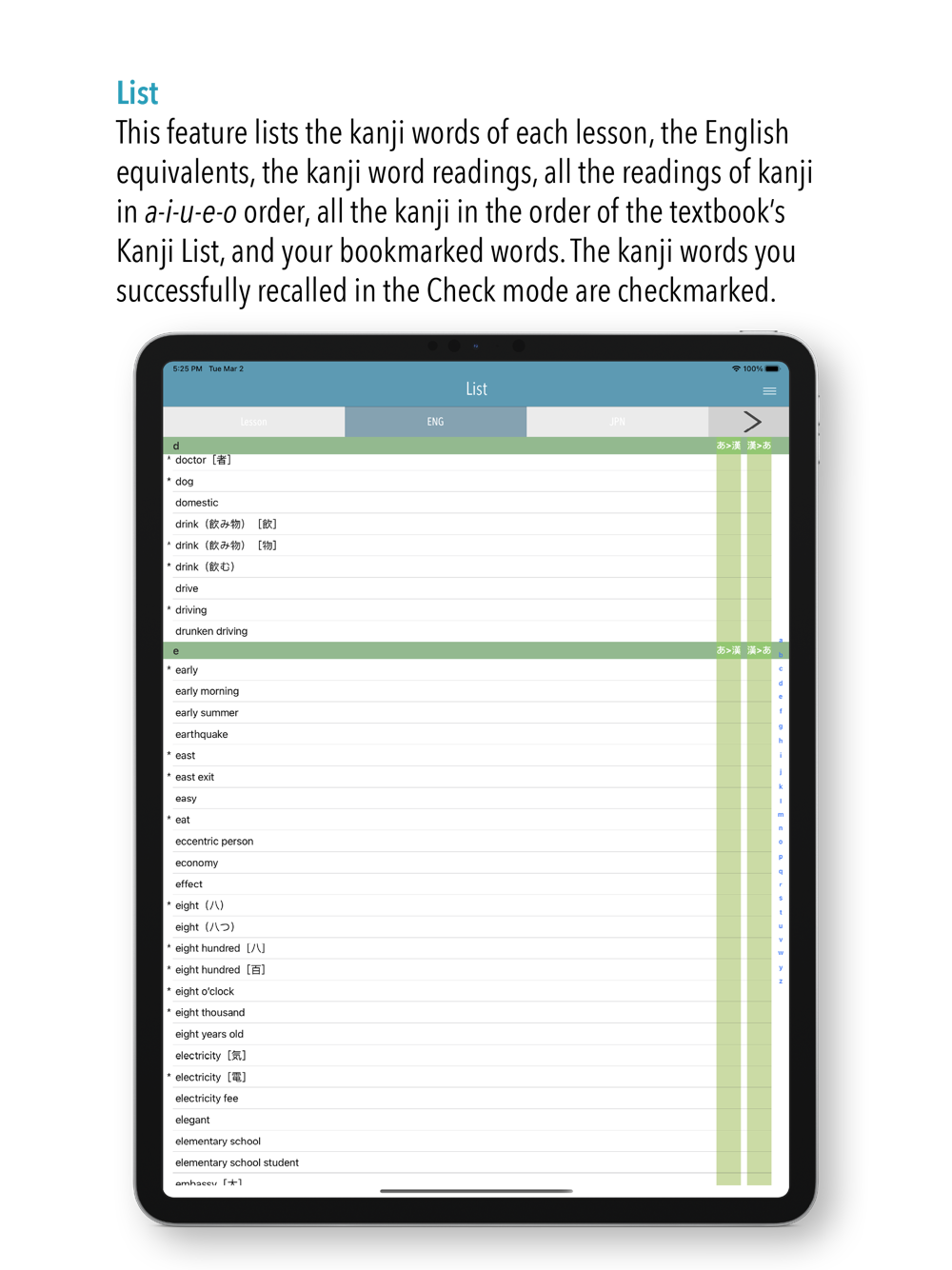 ◇ “List” displays various lists of all the words and kanji covered by the app so that users can see their progress and review them.